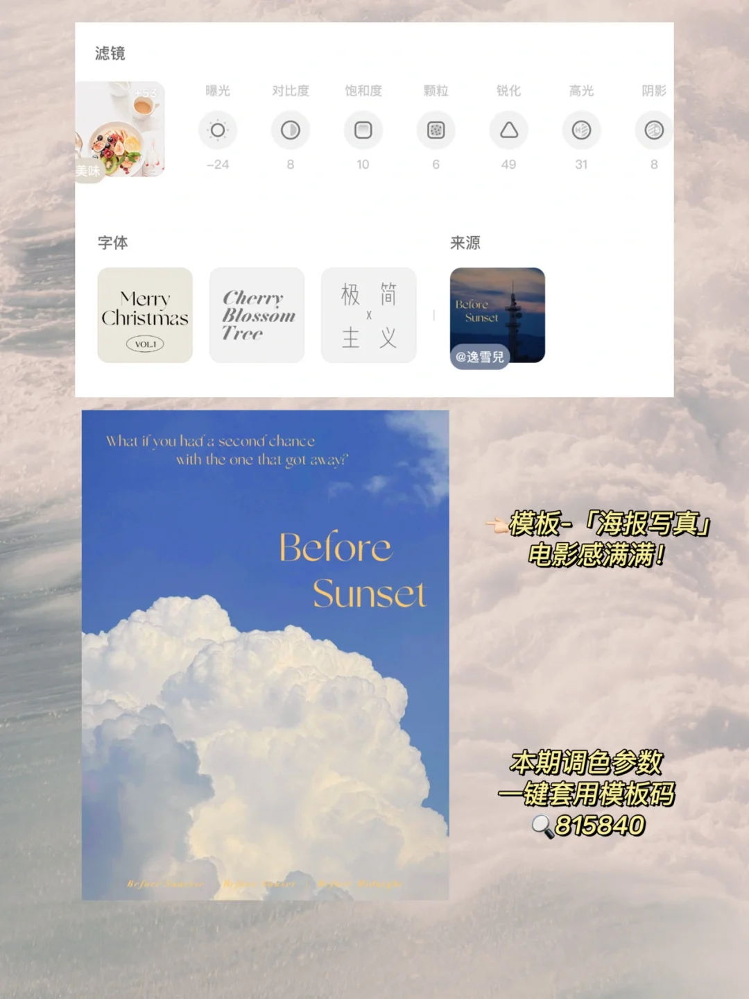 ✨天气好好~棉花糖都在天上☁️通常手机拍不到太远,这个时候就需要后期裁图啦~ . 💻 后期修图教程 🧈黄🧈油🧈相🧈机 滤镜:美味+53 曝光-24 对比度+8 饱和度+10 颗粒+6 锐化+49 高光+31 阴影+8 . 字体:Gallery Modern、Jitzu、文悦后现代体 模板:「海报写真」分类 . 手机调色|调色教程|黄油滤镜调色|调色软件 | 滤镜调色教程| 拯救废片 | 手机拍照 | 手机摄影 喜欢我的分享记得👍🏻|⭐收藏|关注哦 我们下一期再见!🤍