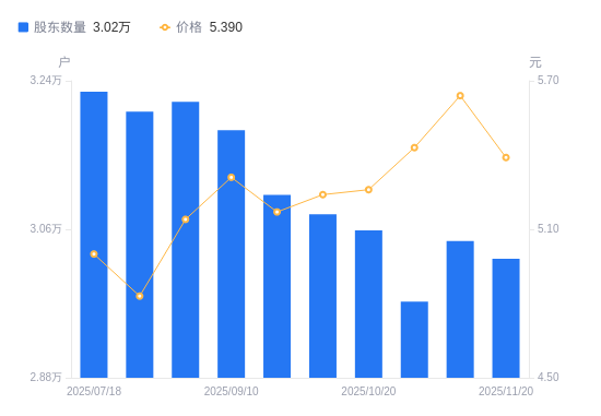 近一年(2024年11月20日至2025年11月20日),德联集团A股股东户数从3.42万户,减低至3.02万户,降幅11.51%,区间股价上涨20.85%。