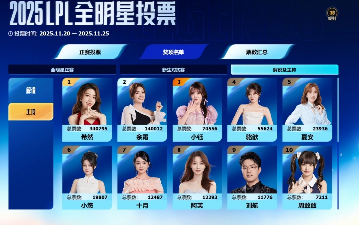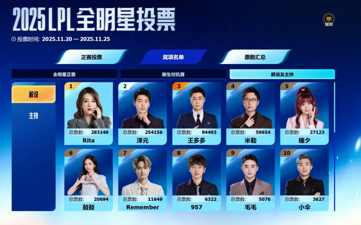 直播吧11月25日讯 2025LPL全明星投票已经结束,今日的最佳解说投票情况,Rita28万票略微领先泽元的25万票,第三的王多多只有9万多票。