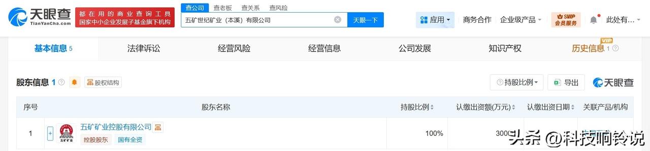 【中国五矿集团在辽宁本溪成立矿业公司 注册资本30亿】 天眼查工商信息显示,近日,五矿世纪矿业(本溪)有限公司成立,法定代表人为刘增社,注册资本30亿人民币,经营范围含非煤矿山矿产资源开采、金属与非金属矿产资源地质勘探、矿产资源勘查、选矿、金属矿石销售、非金属矿及制品销售、矿山机械销售、金属制品销售等。股东信息显示,该公司由中国五矿集团旗下五矿矿业控股有限公司全资持股。 天眼查信息: