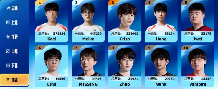 LPL全明星正赛投票辅助:Kael以57万票当选第一,Meiko第二