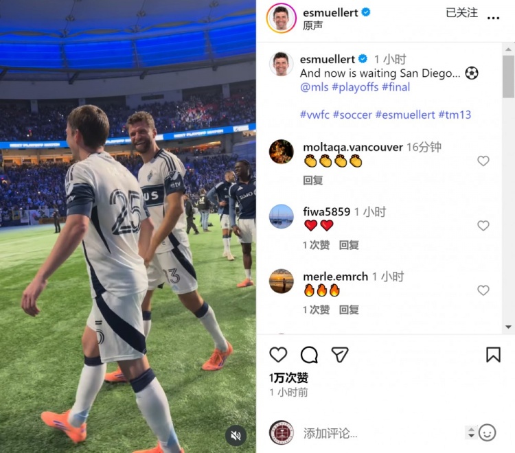 温哥华白浪前锋穆勒更新社媒动态,展望西区决赛,他写道:“现在我们等着圣迭戈FC。”