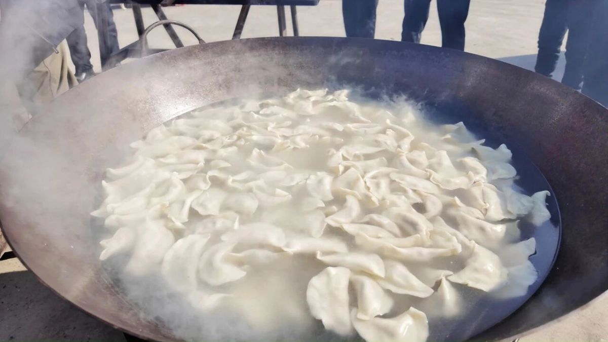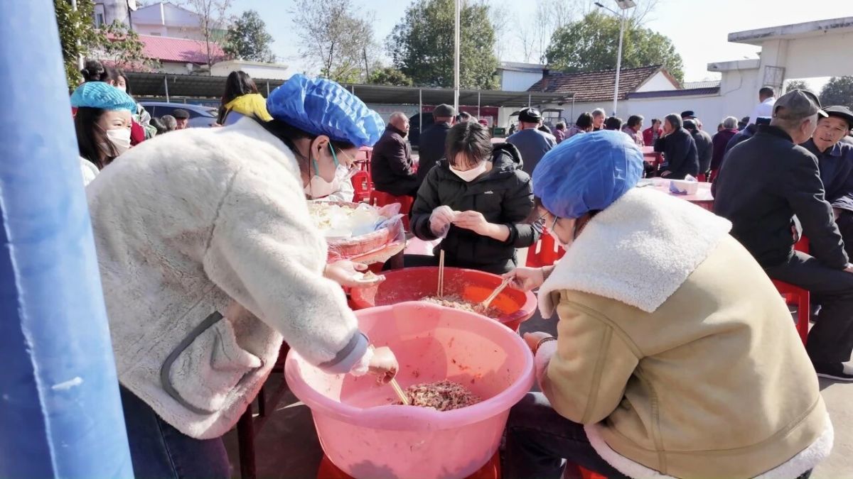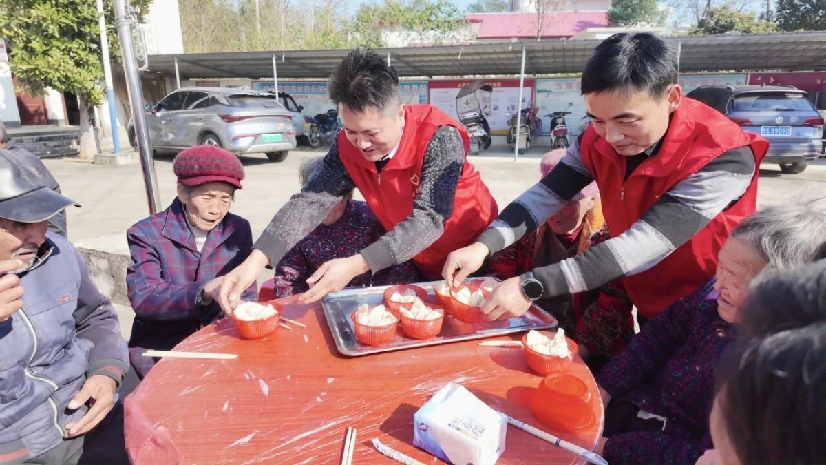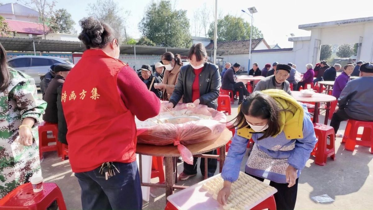 拍照间隙,饺子宴的香气已弥漫整个大院。方集镇志愿者、村民与学生们分工协作,和面、擀皮、调馅、包饺子、炖鹅块,各个环节井然有序。固始本地鹅肉的鲜香混着葱姜气息,让整个院子都充满烟火气。正午时分,热气腾腾的饺子与香气四溢的固始鹅块陆续出锅。志愿者们端着餐盘稳稳走向各桌,将热食送到老人面前。老人们一边品尝美食,一边互相欣赏新鲜出炉的合影,心满意足。