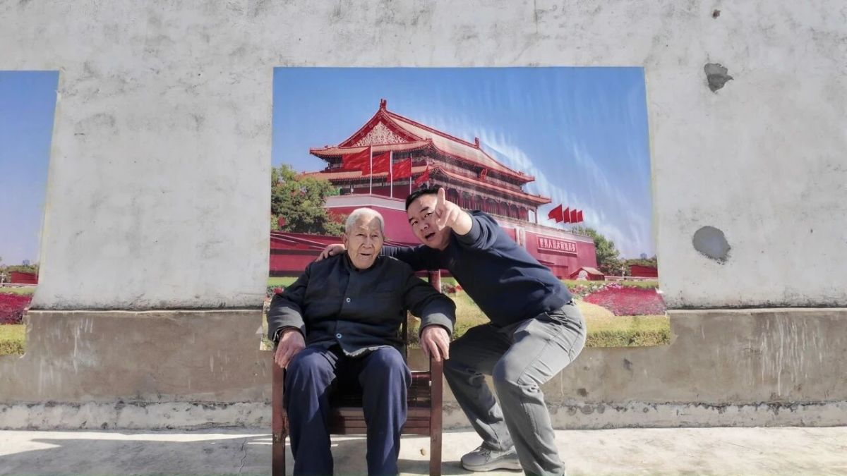 初冬的风卷着山坳的凉意掠过脸颊,但信阳市固始县方集镇杨岗村党群服务中心的大院里,却被饺子的香气和老人的笑语裹得严严实实。11月21日上午,“鹅香聚乡情,振兴话团圆”主题饺子宴在此热闹开席,而大院角落正上演着更动人的场景——信阳职业技术学院的学子们支起两块印着天安门的幕布,为村里的白发老人们张罗“首都合影”,一场温暖的“圆梦行动”悄然开启。