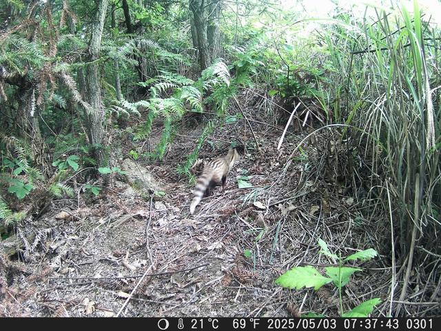 据了解,本次监测还同步记录到豹猫(Prionailurusbengalensis)、毛冠鹿(Elaphoduscephalophus)、猕猴(Macacamulatta)3种国家二级重点保护野生动物的活动痕迹。它们在新晃不同区域的广泛分布,与小灵猫的频繁亮相形成呼应,共同勾勒出该县生物多样性的丰富图景,彰显了当地生态保护工作的显著成效。