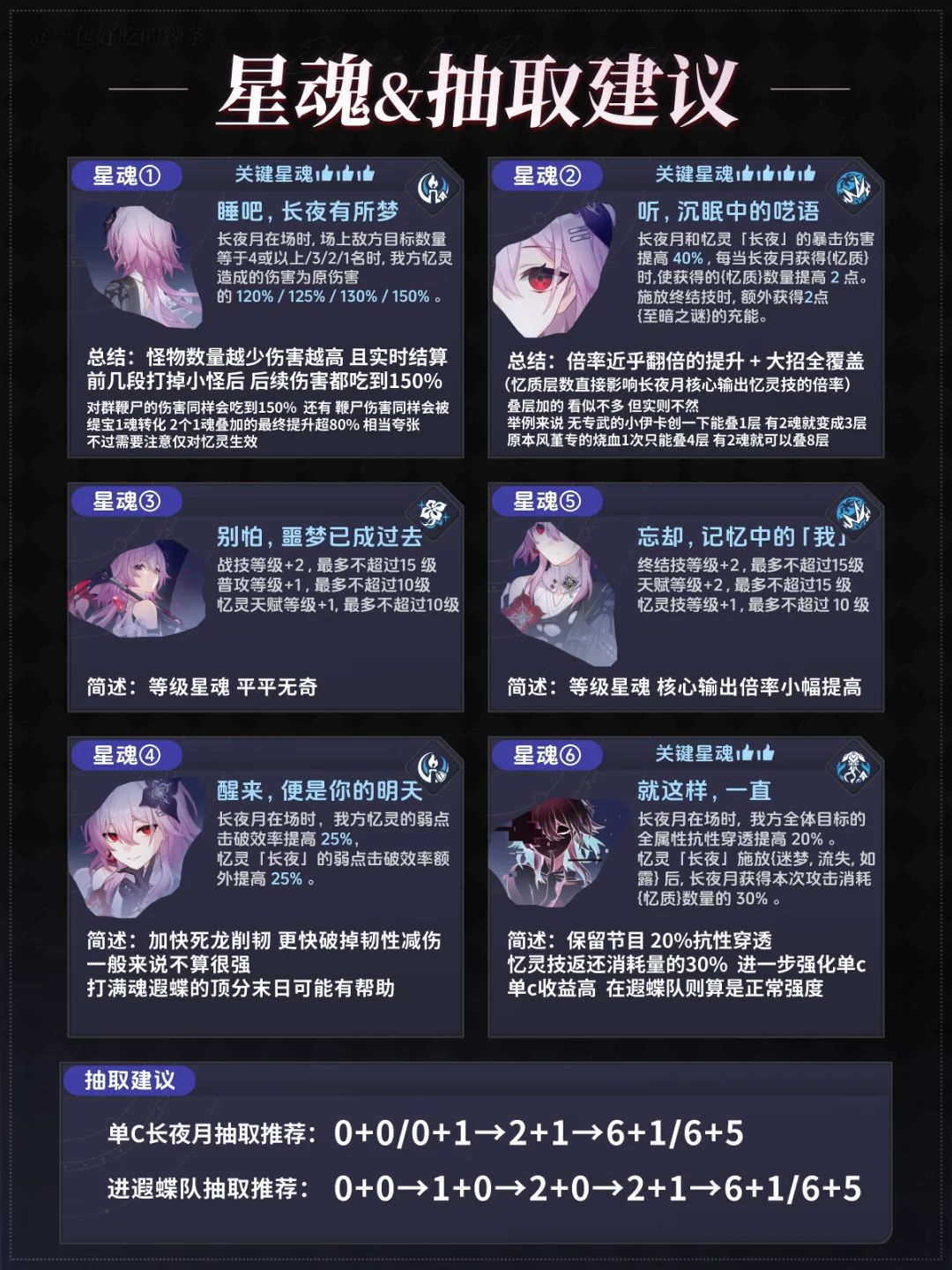 滴滴!这里是辣条 来晚了,这期是长夜月的前瞻攻略 希望能帮助到大家,提前祝大家抽卡不歪 - 另外在抽取建议部分,如果你没有缇1 或者鉴定的想等新队友,我建议00之后先观望 因为1魂如果不考虑缇1的收益 其实只比专武强一点点 打异相仲裁基本一样 如果计入缇1 那么在虚构这种小怪被龙一两口就喷死的环境 提升非常夸张 2个1魂理论能算出80%的夸张提升 -