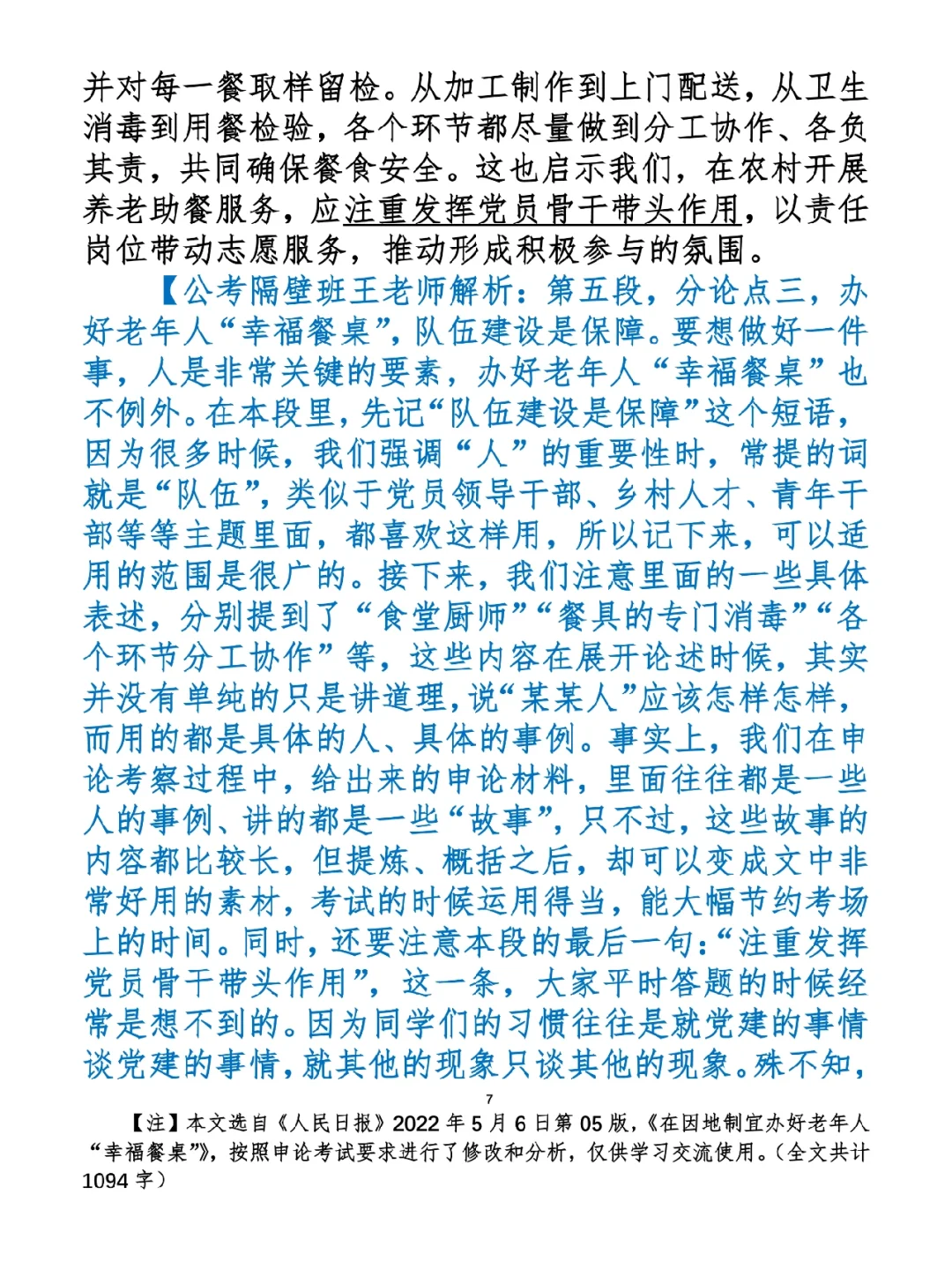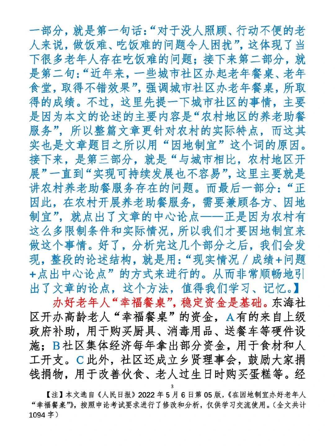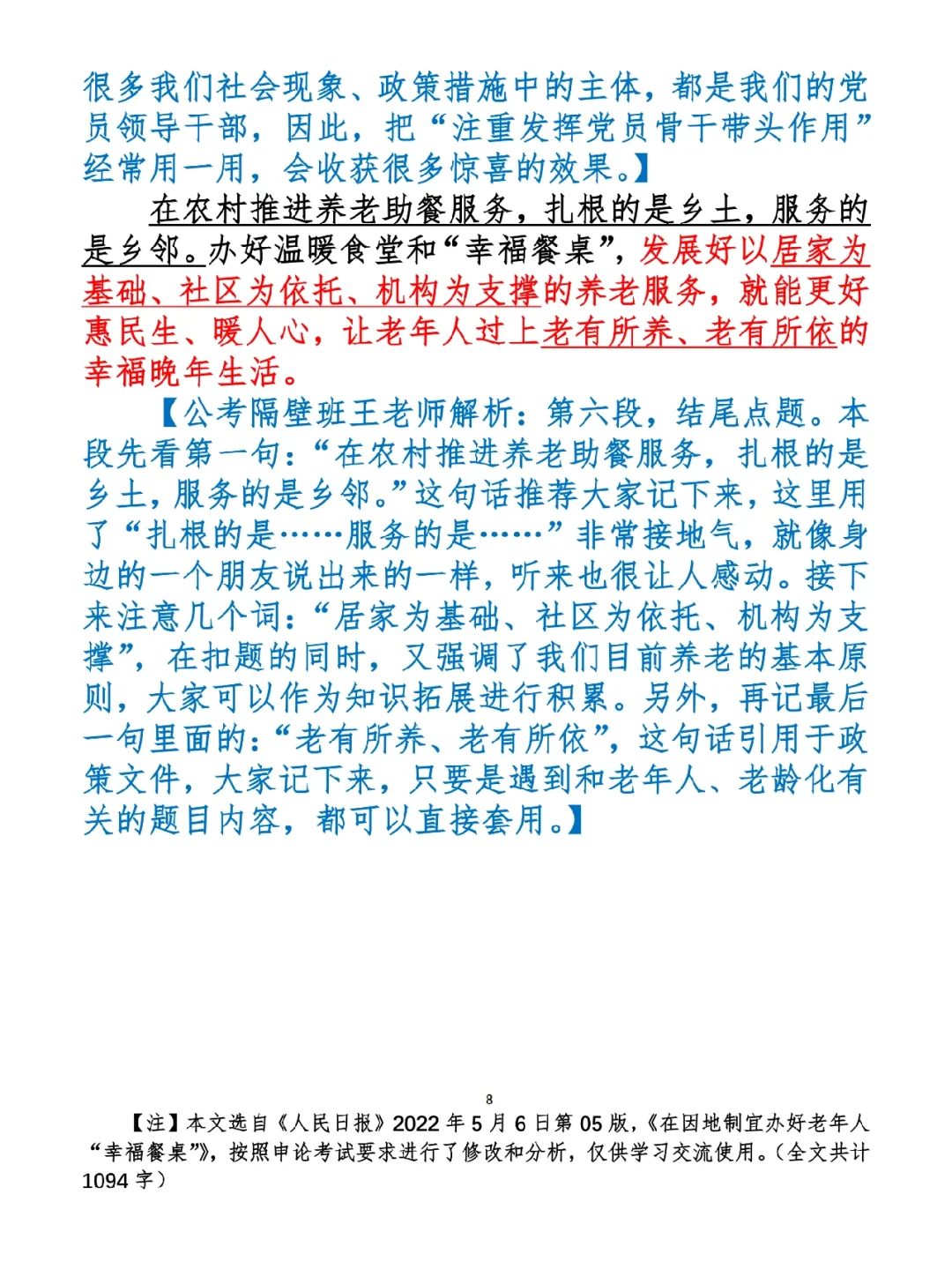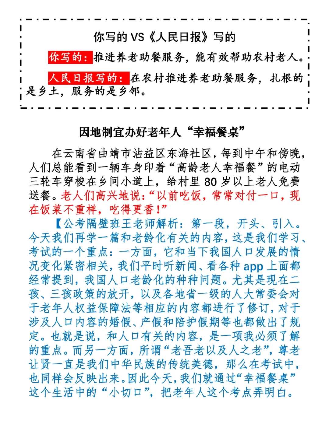1.如何抄写:每天的抄写文章以图片形式发在“公考隔壁班王老师”账号,红色字是重点句和结构句,黑色字是正文,蓝色字是解析,大家抄写时不必抄蓝色字。建议先通读全文(包括蓝色解析部分),做到心中有数再开始抄写,效果会更好。 2.关于文章:抄写文章来源于人民日报,但每篇文章我都根据申论考试要求进行了修改,主要集中在四个方面:一是重写或修改开头、结尾;二是统一段首句句式结构;三是调整段落字数,使文章结构更均衡;四是简化复杂长难句,使之更具可模仿性。每篇文章修改幅度不同,无论修改多少,都是基于申论考试要求,毫无对人民日报文章品评之意。(此处致敬人民日报) 3.关于解析:我会在文章每段后面加一段蓝色字的解析,是我自己在抄写时的感悟,篇幅时间有限,不能面面俱到,但求重点突出。如果你有其他感悟,也希望能在评论里分享,我们相互学习、共同进步。 ⭐️ ⭐️ ⭐️ ⭐️ ⭐️ ⭐️ 这里是公考隔壁班王老师独创的“每天半小时 申论80分”抄写团,欢迎加入我们!