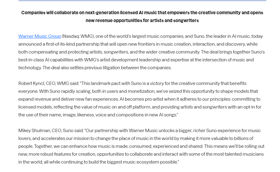 去年,华纳和其他主要唱片公司起诉Suno及其竞争对手Udio,指控这两家初创公司在其AI平台中使用受版权保护的材料,而不对艺人或公司进行赔偿。华纳和环球音乐集团最近都与Udio达成和解,并达成协议,就新的商业音乐创作和流媒体服务进行合作。