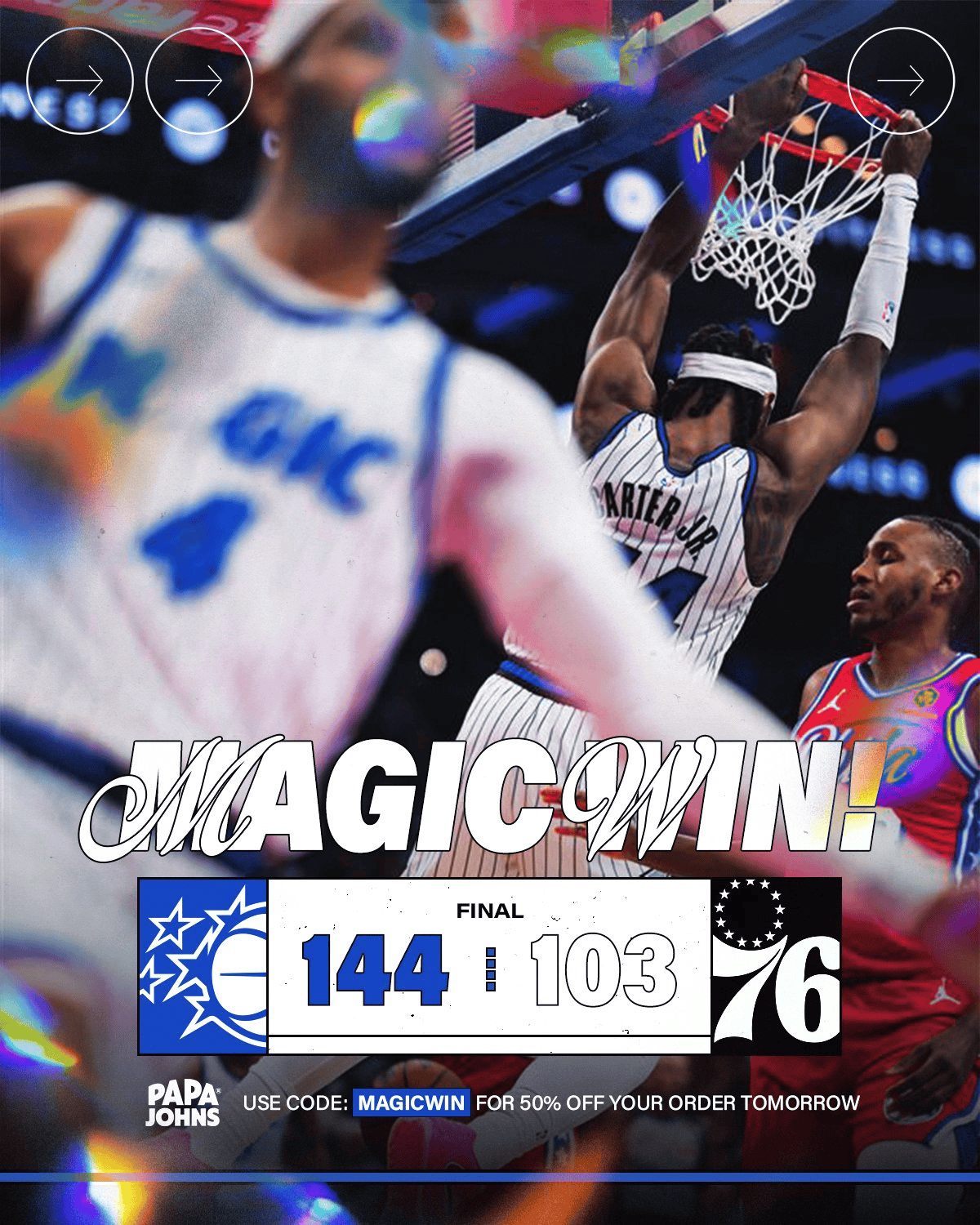 虎扑11月26日讯今日NBA杯小组赛,魔术144-103大胜76人。