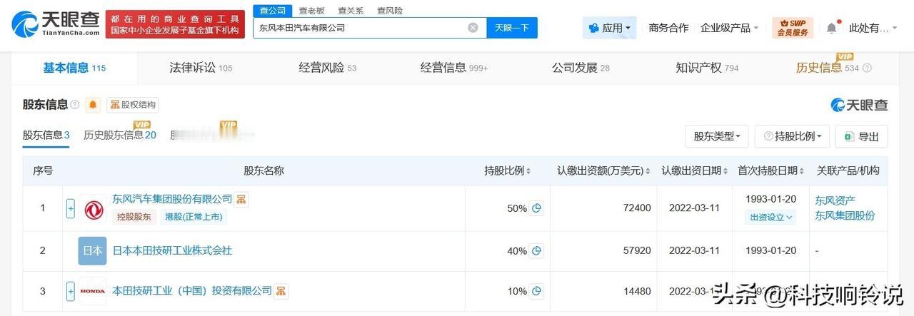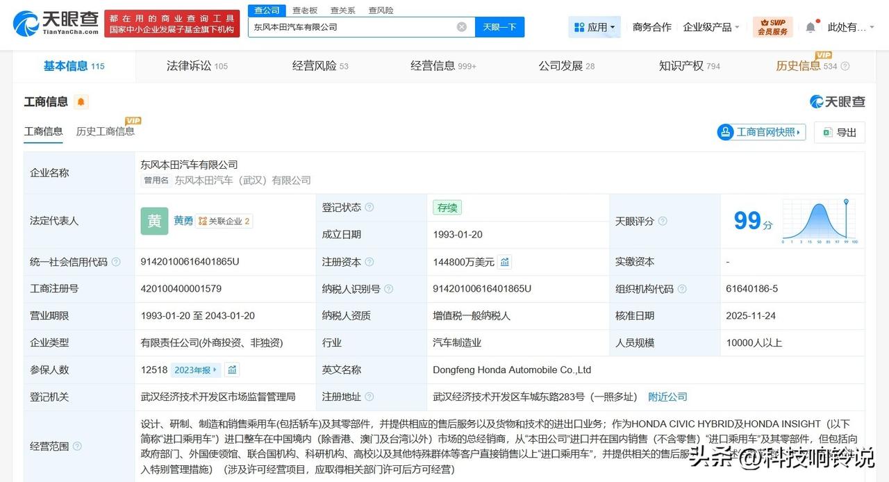 【东风本田汽车公司换帅 黄勇任东风本田汽车公司董事长】 天眼查App显示,近日,东风本田汽车有限公司发生工商变更,张祖同卸任法定代表人、董事长,由黄勇接任,同时,多位高管均发生变更。 该公司成立于1993年1月,注册资本14.48亿美元,经营范围含设计、研制、制造和销售乘用车及其零部件,并提供相应的售后服务以及货物和技术的进出口业务等。股东信息显示,该公司由东风汽车集团股份有限公司、日本本田技研工业株式会社、本田技研工业(中国)投资有限公司共同持股。 天眼查信息: