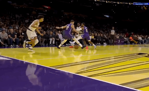 第三节比赛中,科比-布朗送出穿裆击地妙传,科比-桑德斯底线空切双手暴扣。