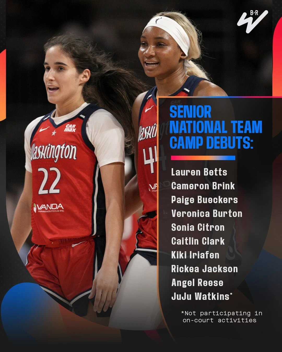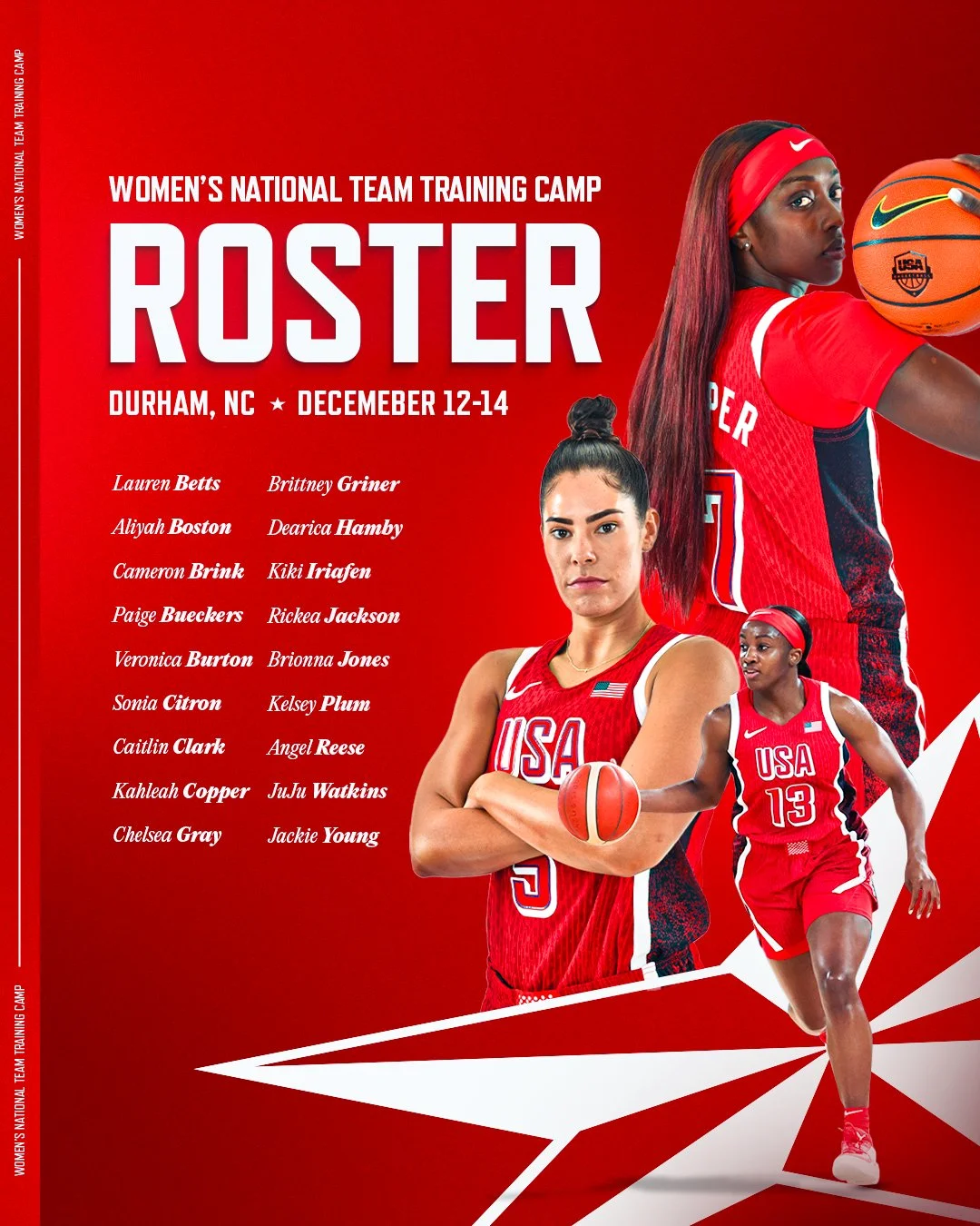 美国女篮国家队12月训练营18人名单正式公布,其中10人将首次参加成年国家队训练营:凯特琳-克拉克、佩奇-布克斯、卡梅隆-布林克、安吉尔-里斯、里奇亚-杰克逊、索尼娅-西特龙、奇奇-伊利亚芬、维罗妮卡-伯顿、劳伦-贝茨、朱朱-沃特金斯(仍在ACL恢复,但有机会学习并融入国家队项目)。