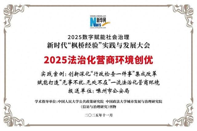 这一变化,正是嵊州市公安局为破解“多头查、重复查”扰企难题探索的创新做法。日前,由新华网主办,中国人民大学公共政策研究院、中国政法大学城市发展与治理研究院、《信访与治理研究》刊物提供学术指导的“2025数字赋能社会治理·新时代‘枫桥经验’实践与发展大会”在北京举行。其中,嵊州市公安局申报的《创新深化“行政检查一件事”集成改革赋能打造“无事不扰、无处不在”一流法治化营商环境》案例,入选“2025法治获得感案例”展示名单,为我省唯一。