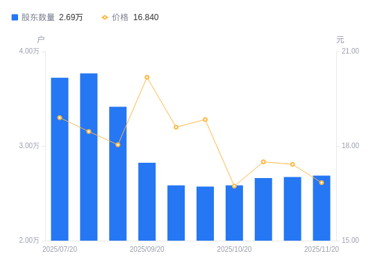 日期A股户数(户)流通A股户均持股数(股)户均持股市值(万元)2025-11-202688413826.2323.282025-11-102673513903.2824.222025-10-312661313967.0224.442025-10-202584714380.9524.062025-10-102571914452.5227.232025-09-302584114384.2926.752025-09-202823713163.7326.562025-08-203415010884.4619.642025-07-31376899862.4118.212025-07-20372269985.0718.87