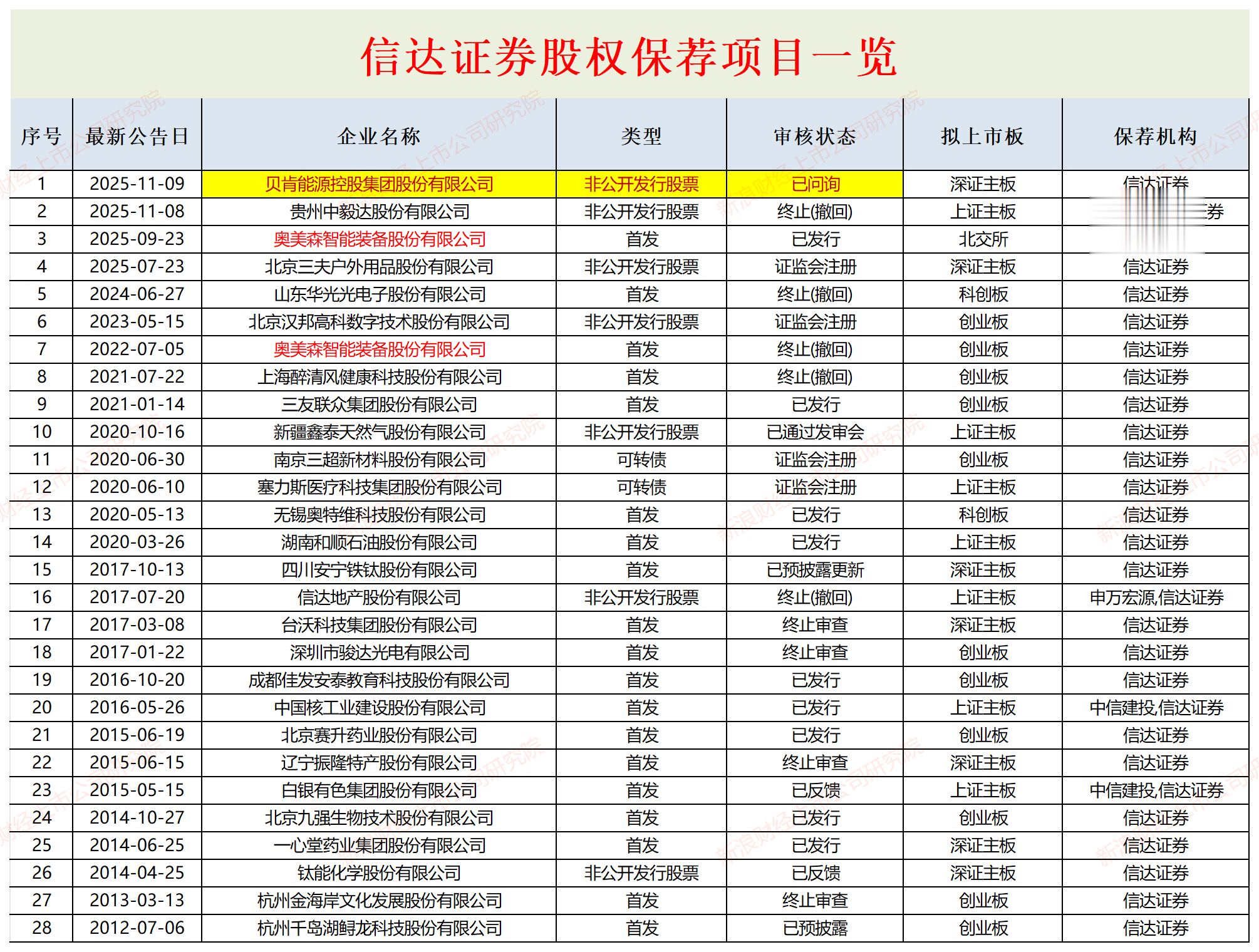 公开资料显示,信达证券目前储备的股权投行项目(包括IPO、定增、配股、可转债)仅有1家(以交易所受理为标准,不包含已终止和已发行项目),这家项目就是贝肯能源的定增。