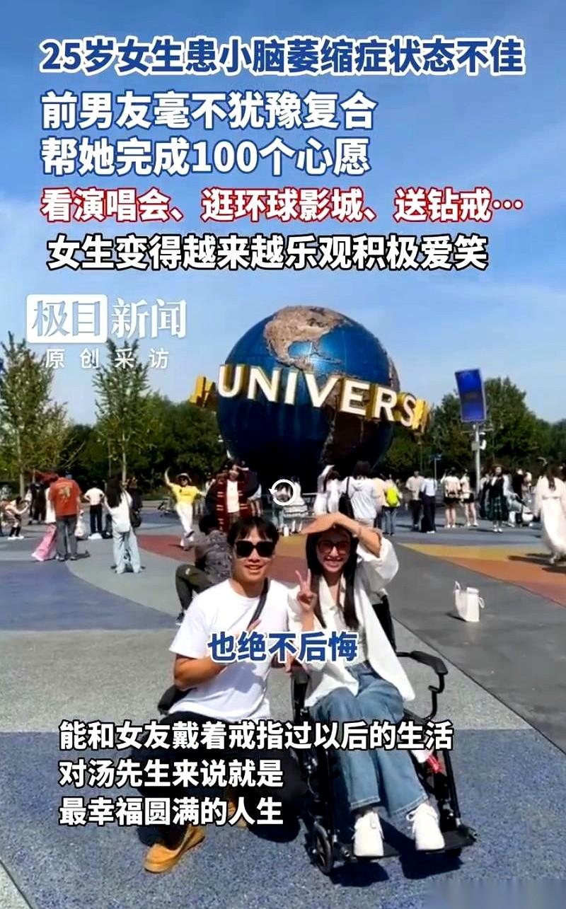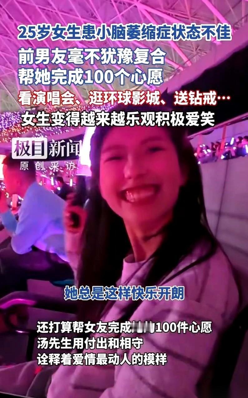 他本来可以跑的。 真的,名正言顺地跑掉。毕竟都分手了,前女友得了治不好的病,而且是眼睁睁看着身体一天天“融化”的那种绝症。 换你,你跑不跑? 但这哥们儿,他回来了。 一头扎了回来。 扎进了一个什么样的生活里? 做饭、洗漱、端屎端尿、康复训练……这些词说出来轻飘飘,做起来,一天就能把人压垮。 何况,他要面对的,是一个曾经爱笑的姑娘,在被病痛折磨到偷偷哭泣,对生活失去全部信心的爱人。 他回来,不是为了上演什么感动中国的戏码。 我觉得他就是心疼,就是放不下。 最牛逼的是,他不止是回来“照顾”她,他是回来“爱”她的。 他要陪她完成100个心愿。 带她去看她最爱的邓紫棋,在人潮汹涌的演唱会上,给她戴上钻戒。 那个钻戒,不是什么“我会让你幸福”的承诺。 那分明是在说:“别怕,以后再难的路,我陪你坐着轮椅一起走。” 他说,他也需要她。 这句话,才是整件事里最戳我心窝子的。 这不是施舍,不是可怜,不是单方面的付出。而是一种灵魂的相互需要。 “你的存在,就是我的圆满。” 说白了,这才是爱情最顶级的样子吧。 别再聊什么偶像剧了。 这才是生活这部大戏里,最动人,也最扎心的,一束光。