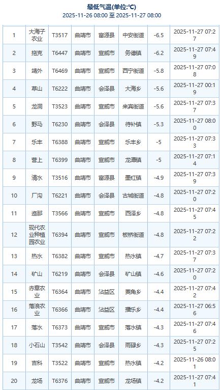最低气温排名前十的为:富源中安街道大海子农业零下6.5宣威务德拖克零下6.2西宁街道靖外零下5.8会泽大海草山零下5.6宣威来宾街道龙洞零下5.6会泽待补野马零下5.3宣威龙潭营上零下5.0乐丰零下5.0富源墨红清水零下4.9会泽古城厂沟零下4.8。