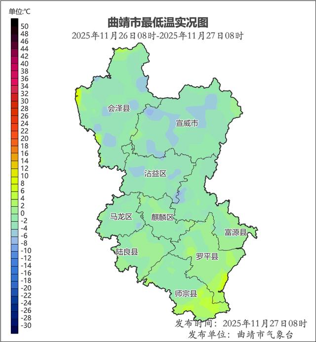 实况通报:11月27日凌晨各县(市、区)城区测站最低气温(℃):宣威零下1.4富源零下1.4陆良零下0.9马龙零下0.6沾益零下0.5师宗零下0.4会泽0.0罗平1.3麒麟2.0。