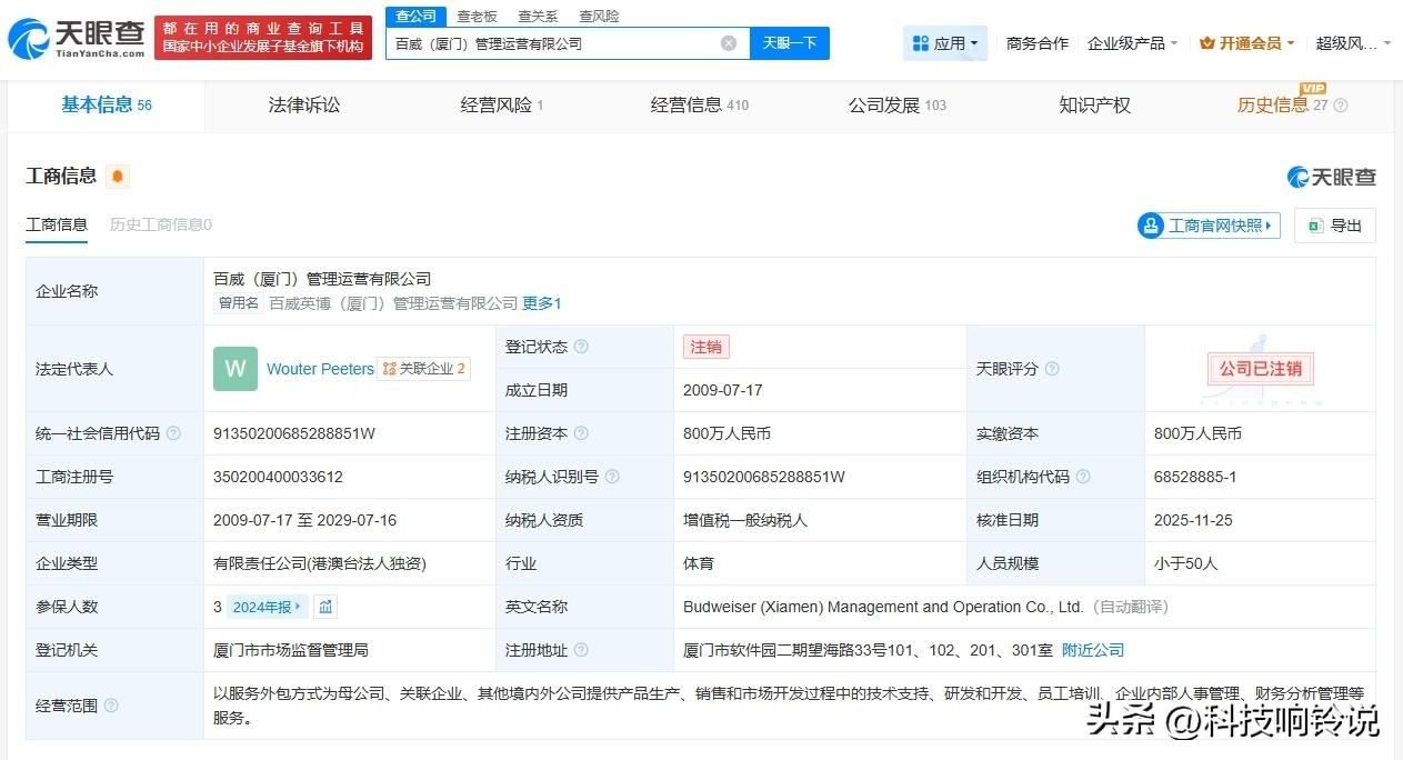 【百威厦门管理运营公司注销】 天眼查App显示,近日,百威(厦门)管理运营有限公司登记状态由存续变更为注销。此前,该公司已发布简易注销公告。 该公司成立于2009年7月,法定代表人为Wouter Peeters,注册资本800万人民币,经营范围为以服务外包方式为母公司、关联企业、其他境内外公司提供产品生产、销售和市场开发过程中的技术支持、研发和开发等服务。股东信息显示,该公司由百威投资(中国)有限公司全资持股。 天眼查信息: