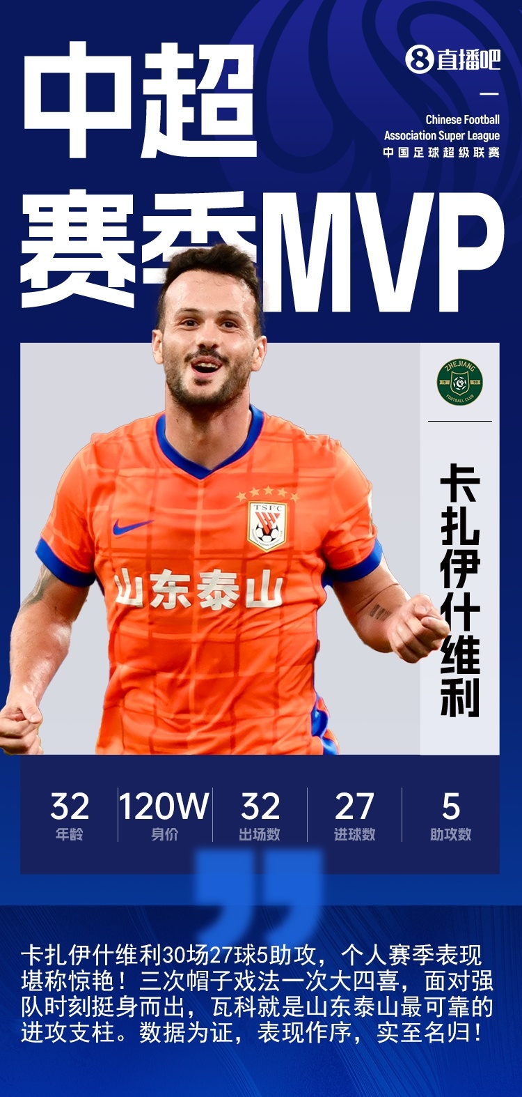 直播吧2025赛季中超MVP评选结果出炉,山东泰山前锋卡扎伊什维利当选,这次评选总计有230720张选票投出,感谢大家的参与!