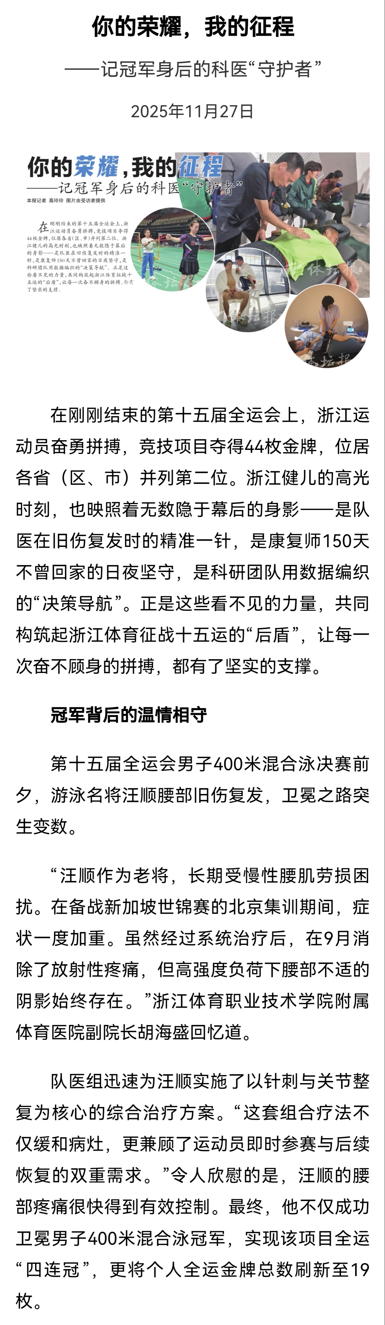 SWim进行时 『8478』20251127 深圳十五运会赛后报道你的荣耀,我的征程——记冠军身后的科医“守护者”「第十五届全运会男子400米混合泳决赛前夕,游泳名将汪顺腰部旧伤复发,卫冕之路突生变数。“汪顺作为老将,长期受慢性腰肌劳损困扰。在备战新加坡世锦赛的北京集训期间,症状一度加重。虽然经过系统治疗后,在9月消除了放射性疼痛,但高强度负荷下腰部不适的阴影始终存在。”浙江体育职业技术学院附属体育医院副院长胡海盛回忆道。队医组迅速为汪顺实施了以针刺与关节整复为核心的综合治疗方案。“这套组合疗法不仅缓和病灶,更兼顾了运动员即时参赛与后续恢复的双重需求。”令人欣慰的是,汪顺的腰部疼痛很快得到有效控制。最终,他不仅成功卫冕男子400米混合泳冠军,实现该项目全运“四连冠”,更将个人全运金牌总数刷新至19枚。」cr体坛报第十五届全运会