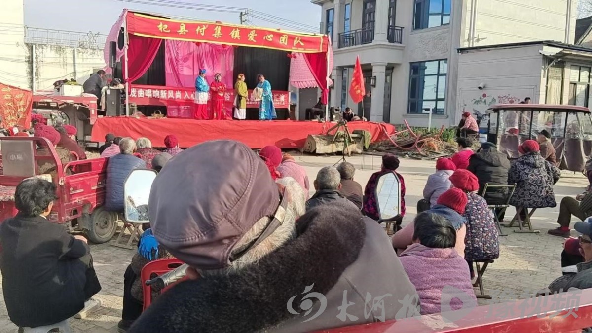 红幕布拉开,傅集爱心表演团的演员们水袖一扬,就把移风易俗的理念揉进了戏文里:《花木兰》选段里,“孝亲敬老重真情”的念白刚落,台下抱着暖壶的大娘就跟着点头;新编版《朝阳沟》里,“婚事新办不铺张、勤俭节约好日子”的唱词,让蹲在墙根的大爷拍着腿叫好。没有生硬的宣讲,只有婉转的唱腔和鲜活的表演,孝老爱亲、抵制铺张的文明理念,就随着戏韵钻进了乡亲们的心里。