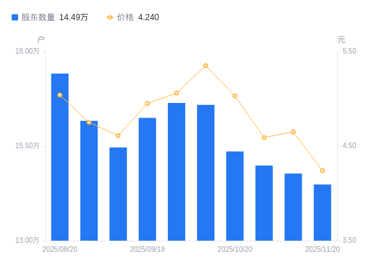 日期A股户数(户)流通A股户均持股数(股)户均持股市值(万元)2025-11-201448539237.873.922025-11-101477359057.664.212025-10-311498758928.334.102025-10-201535808712.944.382025-10-101658707867.594.212025-09-301663907843.003.972025-09-191624408033.723.982025-09-101546488438.503.892025-08-291616498073.033.832025-08-201741547493.353.78