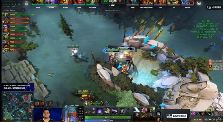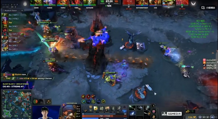 [27分钟]上路团战Ame的TB被动,自己交出换血Xxs兽王,随后yopaj马尔斯框大留人,侧翼XG想动结果被Nikko黑贤拉墙拉了三个!残局Ame的TB被追上高地强杀,OG打出0换2之后拆掉XG上路高地!双方经济差12K!
