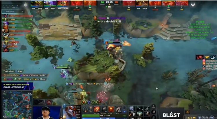 [21分钟]下路团战yopaj马尔斯框大强动Xxs兽王,XG后面集火先打掉了Natsumi先知盾!起身之后Xxs兽王倒下,但是Ame的TB极限换血先知,强行和对面大哥互换!这波最终是OG多个盾的优势,打出了个2换4!