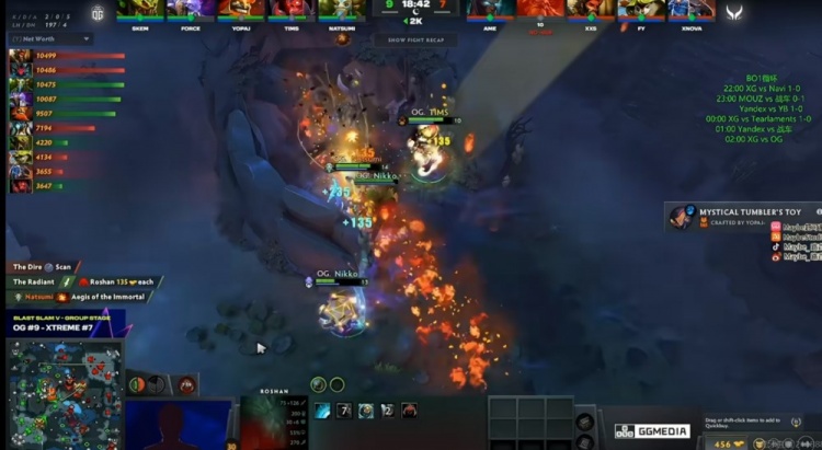 [18分钟]NTS牛头跳大秒掉了skem剧毒,但是随后yopaj马尔斯框大配合队友留住NTS牛头!OG回头拿下一代肉山!Natsumi的先知带盾!XG随后拆掉对手中一塔,还逮捕了skem剧毒!不过yopaj马尔斯一矛配合Natsumi先知开飞,OG再强杀一次NTS牛头!