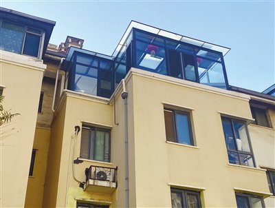 11月21日,记者在现场看到,被投诉的顶楼业主将整个露台改建为玻璃结构阳光房。在该小区同类五层花园洋房,顶楼露台搭建阳光房现象较为普遍。