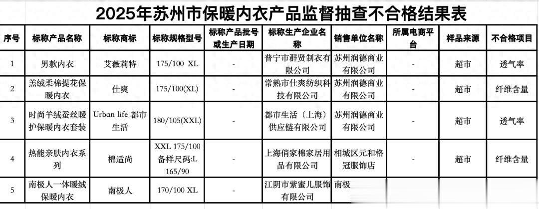 近日,苏州市市场监督管理局2025年保暖内衣产品质量市级监督抽查情况公告(第10期),南极人品牌赫然在列。