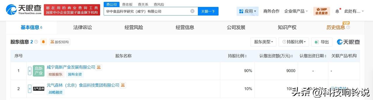 【元气森林等在咸宁成立食品科学研究公司 注册资本1亿】 天眼查App显示,近日,华中食品科学研究(咸宁)有限公司成立,法定代表人为董亚,注册资本1亿人民币,经营范围含自然科学研究和试验发展、新材料技术研发、发酵过程优化技术研发、新材料技术推广服务、工程和技术研究和试验发展、饮料生产、食品生产等,由咸宁高新产业发展有限公司、元气森林(北京)食品科技集团有限公司分别持股90%、10%。 天眼查信息: