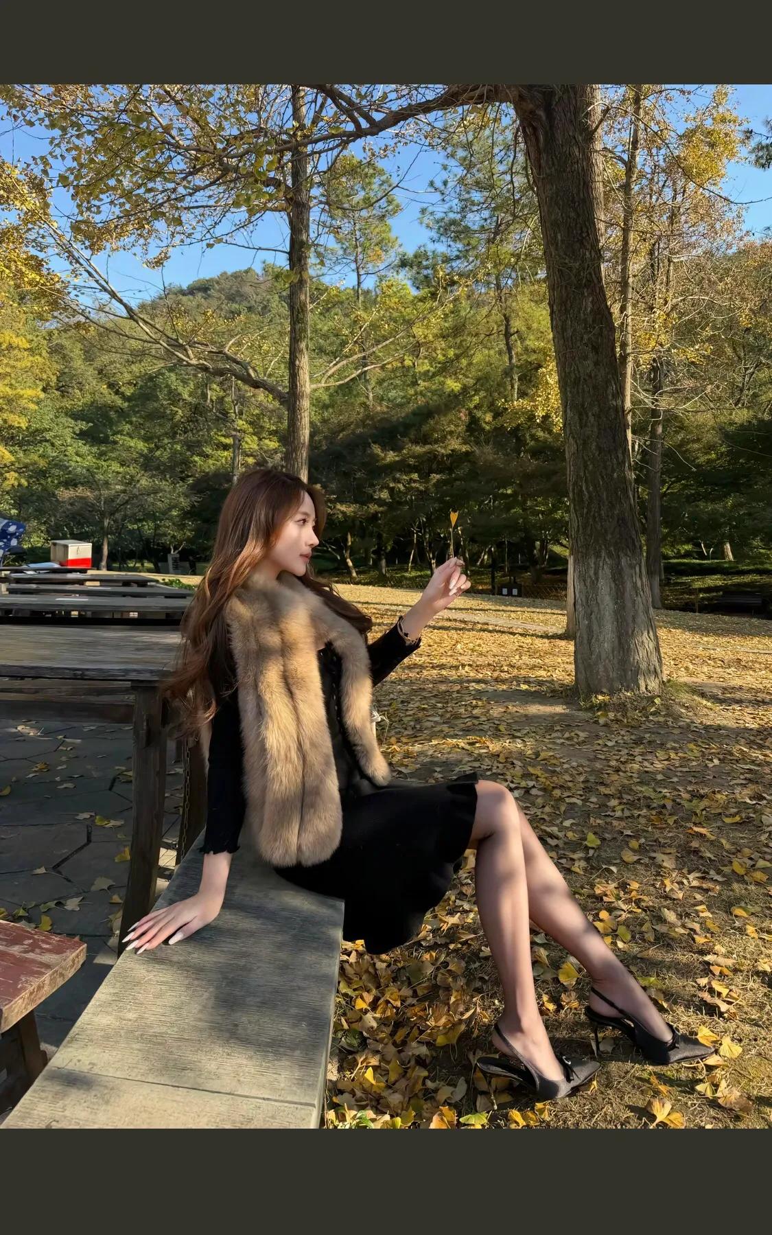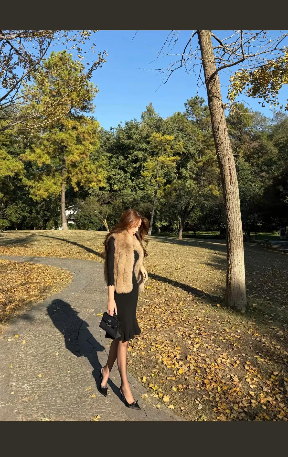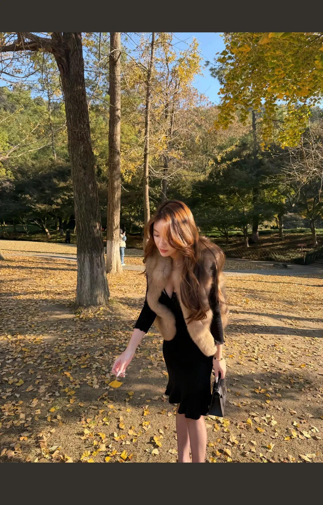 秋日漫步,黑裙与落叶的浪漫邂逅