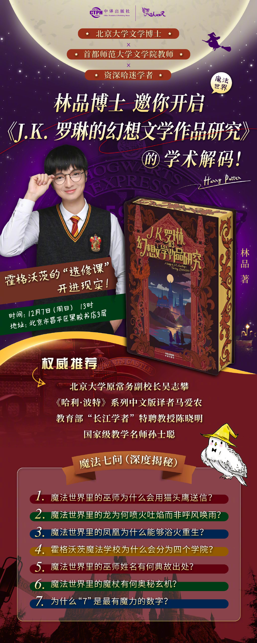 【新书福利】《J.K.罗琳的幻想文学作品研究》《J.K.罗琳的幻想文学作品研究》新书分享暨魔法主题派对即将启动,从关+转的哈迷小伙伴中抽3位,下周 送出本书~亲爱的麻瓜与巫师朋友们,是时候收起迷路的猫头鹰,接受这份来自魔法世界的直接邀请了!12月7日(周六)下午13:00,昌平区建材城西路 MPK黑胶书店,将举办一场以《J.K.罗琳的幻想文学作品研究》为核心的新书分享会,并沉浸于一整天的魔法狂欢。魔法活动包括:沉浸式观影,一同穿越9¾站台,重温魔法之旅的起点;踊跃提问或分享观点,即有机会赢取精美魔法周边;“魔法缘分”抽奖,幸运儿可将定制款【活点地图帆布包】等好礼带回家。同时,现场特备十四款精美主题印章(含四大学院、海德薇等);当天穿着《哈利·波特》元素服饰到场,即可获得惊喜小礼物一份!佳片奇遇季 哈利波特