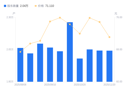 近一年(2024年12月31日至2025年11月20日),义翘神州A股股东户数从2.18万户,减低至2.04万户,降幅6.17%,区间股价上涨21.89%。