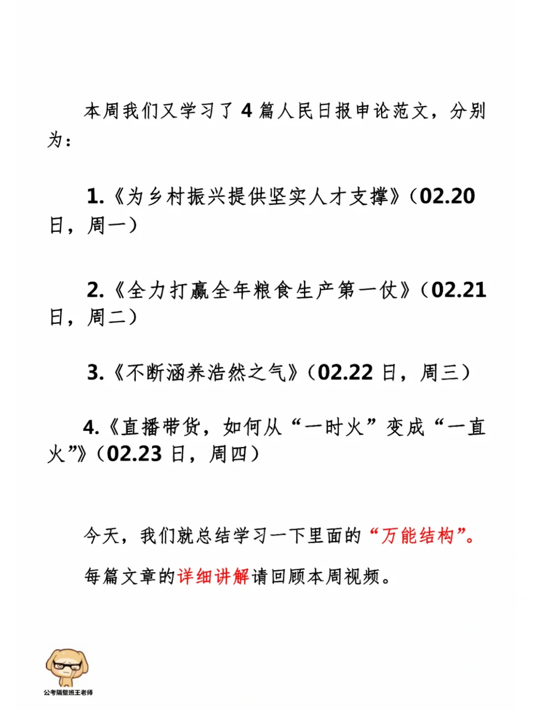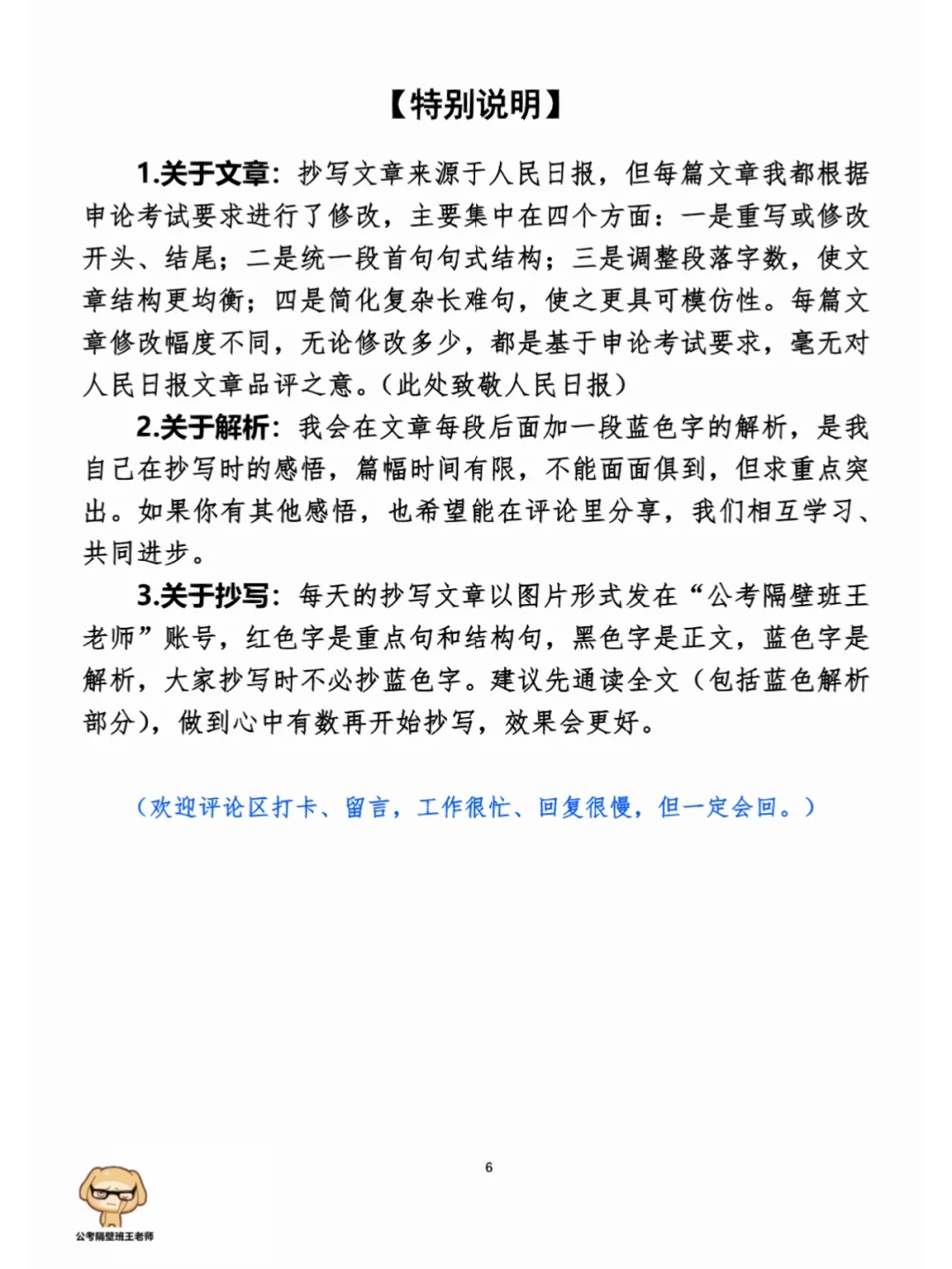如何抄写:每天的抄写文章以图片形式发在“公考隔壁班王老师”账号,红色字是重点句和结构句,黑色字是正文,蓝色字是解析,大家抄写时不必抄蓝色字。建议先通读全文(包括蓝色解析部分),做到心中有数再开始抄写,效果会更好。