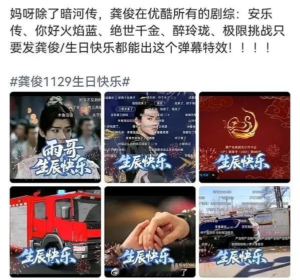 龚俊《暗河传》究竟给优酷赚了多少钱啊,龚俊生日这天它的花样也太多了吧买了多个龚俊《暗河传》苏暮雨生日快乐大屏地广;站内搜龚俊有弹窗祝龚俊生日快乐;所有龚俊在优酷的剧综全集任何地方发弹幕都有生辰快乐的祝福,暗河传有专属雨哥昵称;优酷购全球首店在龚俊生日1129开业且有生日专属福利;海外全平台给龚俊送生日祝福。暗河传
