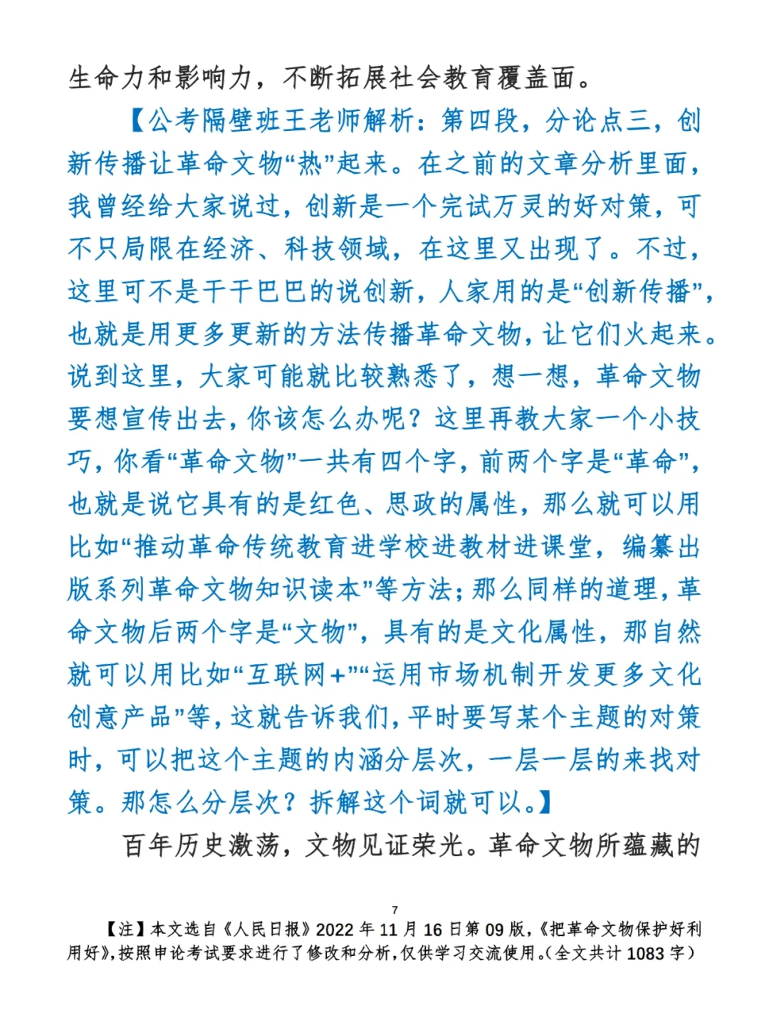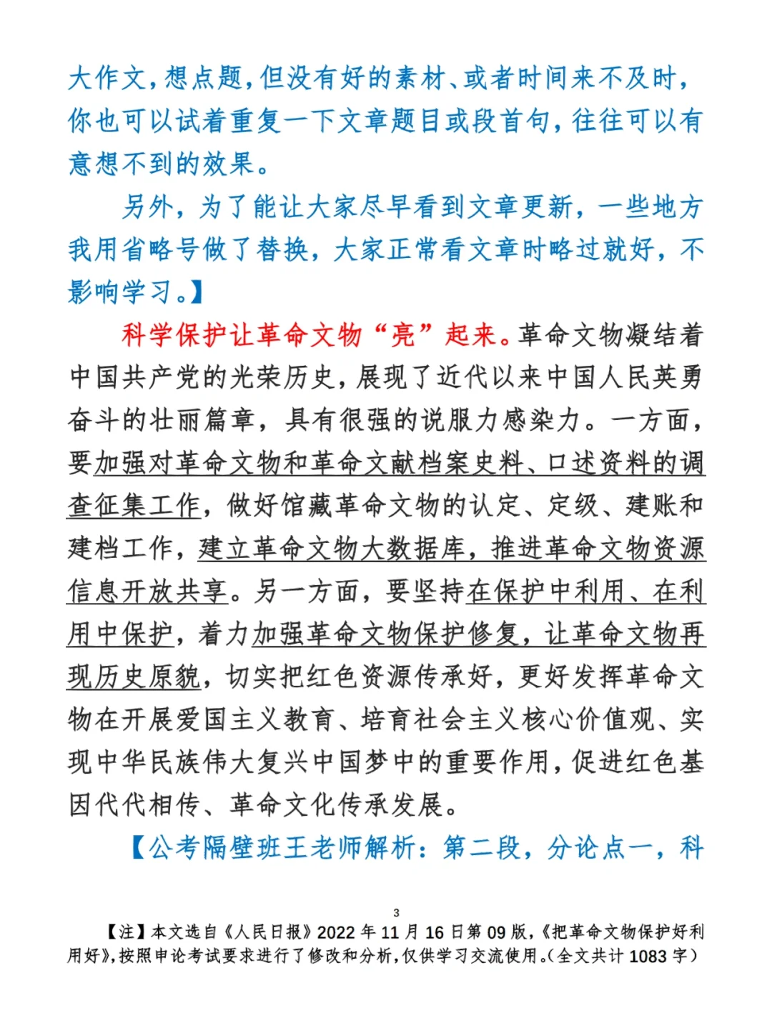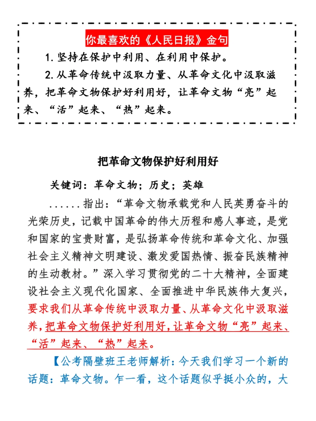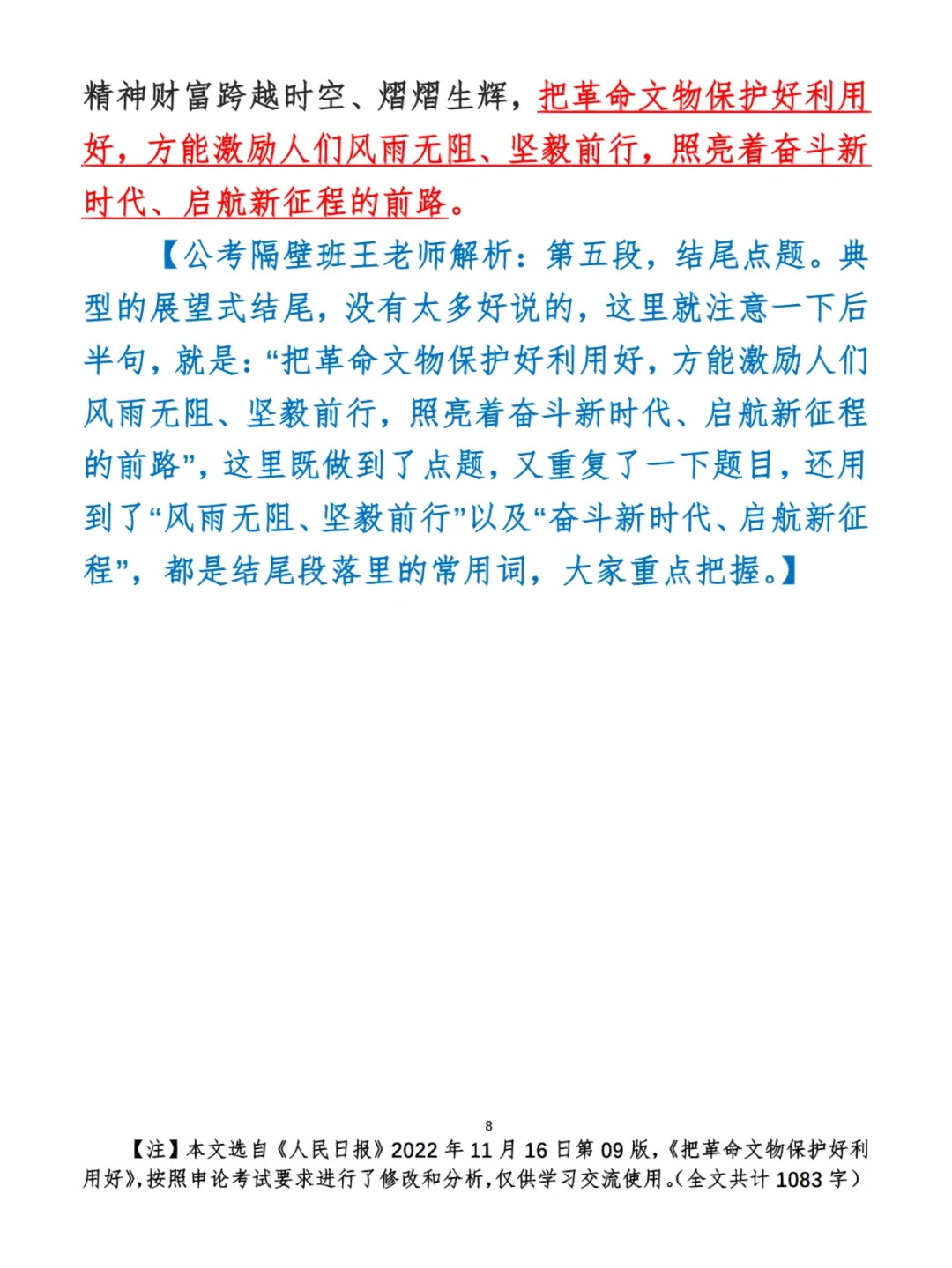 今日打卡作业: 1. 选一句你最喜欢的金句 2. 抄写全文红字+划线部分内容 3. 写完后在留言区打卡 ⭐️ ⭐️ ⭐️ ⭐️ ⭐️ ⭐️ 如何抄写:每天的抄写文章以图片形式发在“公考隔壁班王老师”账号,红色字是重点句和结构句,黑色字是正文,蓝色字是解析,大家抄写时不必抄蓝色字。建议先通读全文(包括蓝色解析部分),做到心中有数再开始抄写,效果会更好。 关于文章:抄写文章来源于人民日报,但每篇文章我都根据申论考试要求进行了修改,主要集中在四个方面:一是重写或修改开头、结尾;二是统一段首句句式结构;三是调整段落字数,使文章结构更均衡;四是简化复杂长难句,使之更具可模仿性。每篇文章修改幅度不同,无论修改多少,都是基于申论考试要求,毫无对人民日报文章品评之意。(此处致敬人民日报) 关于解析:我会在文章每段后面加一段蓝色字的解析,是我自己在抄写时的感悟,篇幅时间有限,不能面面俱到,但求重点突出。如果你有其他感悟,也希望能在评论里分享,我们相互学习、共同进步。 ⭐️ ⭐️ ⭐️ ⭐️ ⭐️ ⭐️ 这里是公考隔壁班王老师独创的“每天半小时・申论80分”抄写团,欢迎加入我们!