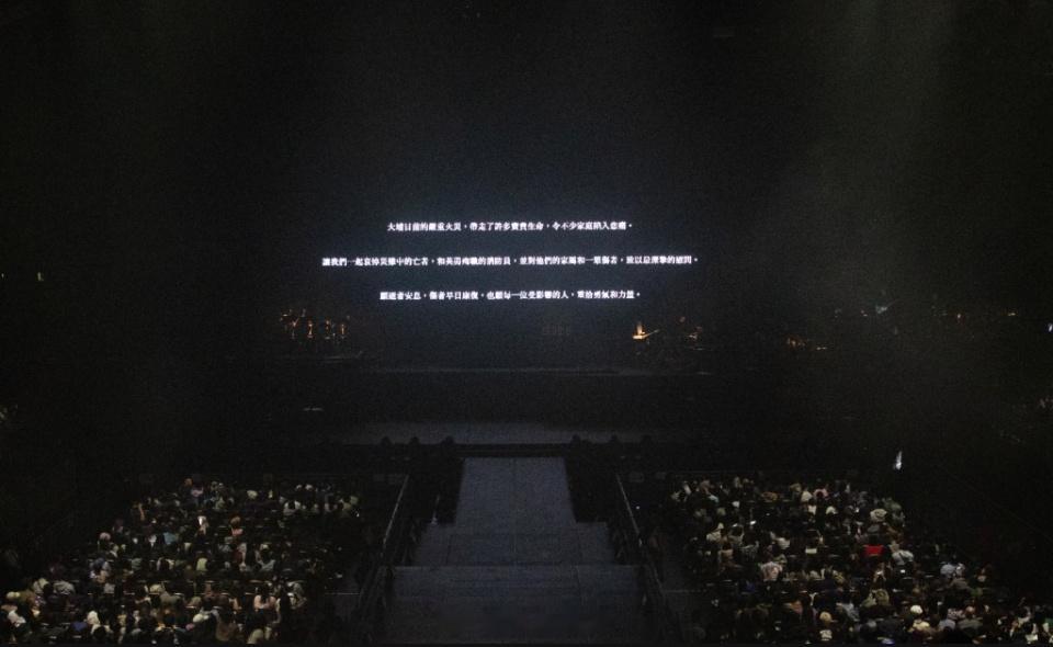 楊千嬅演唱會首場|開唱前捐二百萬 全場為大埔火災默哀 關芝琳林德信Aga神色凝重《楊千嬅Live MY LIVE 2025演唱會》今晚於紅館揭開序幕,原定一連六場的音樂盛宴,因應大埔宏福苑火災事故,轉化為溫暖而莊重的祝福空間。舞台上下的每一個細節,都承載著對香港無聲的關懷。楊千嬅跟團隊捐200萬演唱會主辦單位「正向文化娛樂有限公司」宣布,今日已代表千嬅與團隊捐出200萬港元予東華三院,支援受災家庭。到場支持的圈中好友有 : 關芝琳、林德信,Aga,Yumiko,上山安娜等等,一眾圈中好友亦應千嬅的呼籲,把準備送給千嬅Good Show的花籃,紛紛變為救災善款,所以這晚紅館並無祝福花海湧現。全場默哀1分鐘演唱會於8時15分開始,千嬅帶領紅館上萬顆心,與受影響的家庭同在。千嬅及所有台前幕後工作人員,連同場館觀眾一同靜默一分鐘,為火災事故所有受難者致哀。現場大屏幕上寫下 :「大埔日前的嚴重火災,帶走了許多寶貴生命,令不少家庭陷入悲痛。讓我們一起哀悼災難中的亡者,和英勇殉職的消防員,並對他們的家屬和一眾傷者,致以最深摯的慰問。現在,讓我們一起靜默一分鐘,為這次意外的罹難者致哀。懷念,將會長留心中;此刻相聚的星光,化作前行的力量。感恩今晚彼此同在,以溫暖和勇氣,照亮大家的前路。生命無常,但我們選擇——好好活,好好唱,好好珍惜。節目現在開始」。歌詞別具深意演唱會第一部份千嬅台底坐著渡船緩緩升起,今晚的紅館,紫海依舊閃耀,卻多了一份沉靜的力量。當《笑中有淚》的旋律響起,不再只是個人情感的抒發,更是對受災居民最堅定的陪伴。opening 選唱《舊地》、《最好的債》、《笑中有淚》《大城小事》等作品,歌詞中「過去某日某天親切的臉沒法重遇見」、「誰好或誰壞,一萬年以後已不需要分解,我只盼今生可釋懷」、「當我無情無恨望過去,還是笑中有淚……」等句,今晚聽來都別具深意。工作人員穿上黑色服裝下午的拜神儀式上,全體工作人員自發穿上黑色服裝,以最樸素的方式,呼應全港連日來的沉痛心情。這份尊重延續至夜晚的舞台——樂手們一致換上黑色演出服;楊千嬅的演出造型也連夜調整,將鮮艷轉為沉靜。其中一件原為紅色的戰袍,經團隊通宵趕工,化作黑白金三色,在燈光下低調閃耀。第一部份畫面通宵改動默哀後,團隊收拾心情,大家帶著做好個騷同心前行,整晚的演唱會,堅定以承載著療癒與前行的力量為主題。因應火災事故應變,據知首段演出中一段視覺效果,已大部份刪除及連夜通宵重新改動。歌迷會場外派發捐款QR Code響應大會宣佈,演唱會頭場收益及六日週邊產品收益全數捐出作救災善款,千嬅歌迷紛紛響應,非常有愛,下午三點週邊產品早已排滿等侯購買的人群,黃昏所有今日週邊產品,近乎全部售罄,大量海外歌迷不停詢問,除了購買週邊外,想再獨立捐款,但鑑於大會不夠時間向有關單位伸請設立善款收集箱,所以場外,千嬅歌迷會「千嬅群英會」馬上行動,讓這份溫暖不斷延展。於紅館場外派發捐款QR Code傳單,讓其他海外歌迷如想捐款可掃描東華三院捐款的QR Code。希望愛心不分大小,善意不論遠近,讓掌聲化為祝福,照亮受難者前行的路,一同用愛,溫暖香港 。