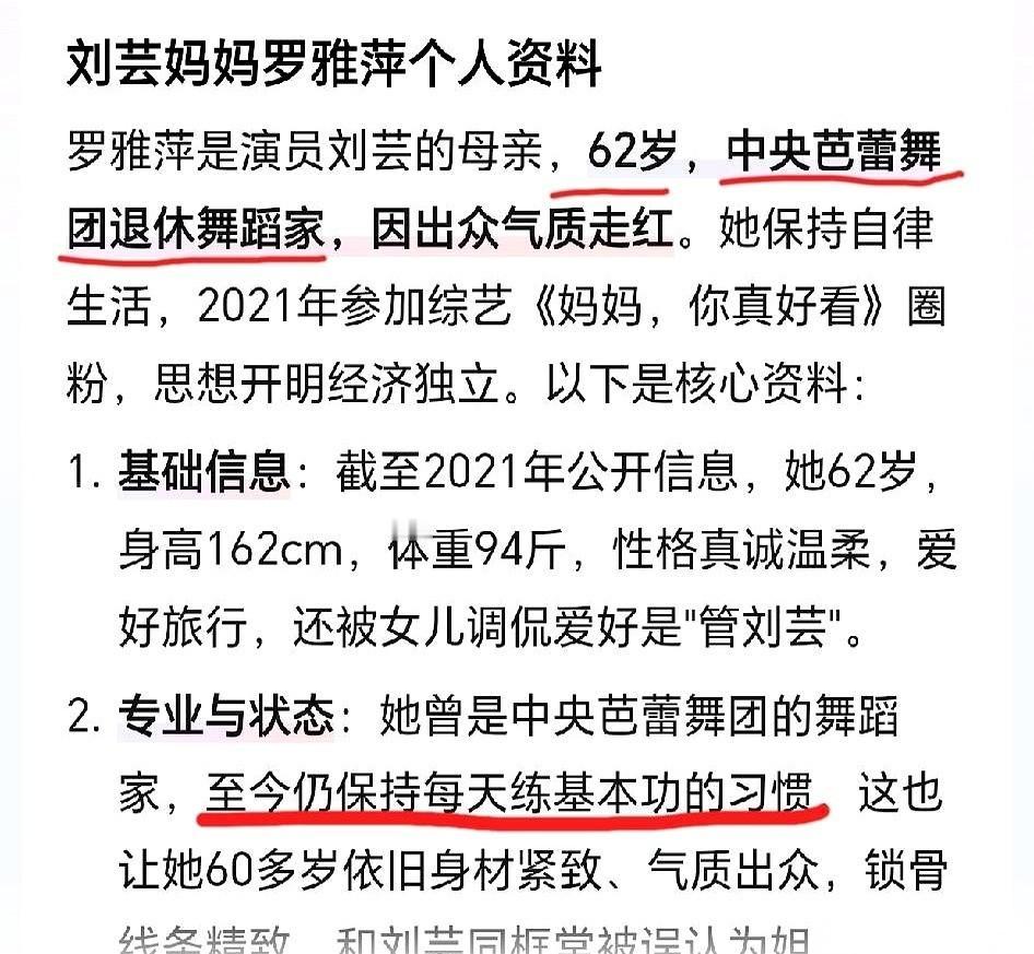 这一眼看过去,谁敢信这是62岁? 刘芸她妈这状态,简直是给咱们这帮天天喊着“抗衰”的年轻人“啪啪”两记耳光! 你就看郑钧站在丈母娘旁边那画面,我不厚道地笑了。 老郑是真·摇滚老炮,一脸的沧桑和故事; 再看丈母娘,那是真·岁月不败美人。 俩人往那一站,不知道的还以为是哪家的大姐带着个看起来挺着急的弟弟。 难怪网友嘴损:这哪是郑钧配不上刘芸啊,看着感觉连丈母娘都配不上! 但这真不是一般的“冻龄”,这种气质,玻尿酸是打不出来的。 人家退休前是中央芭蕾舞团的角儿,那是国家队的底子! 最吓人的是啥? 是自律。 退休这么多年,雷打不动天天练功。 你看那挺拔的背,那舒展的肩颈线,这哪里是靠保养品堆出来的?这是几十年如一日的汗水泡出来的! 刘芸跟她妈站一块,说是姐妹花都显得生分,简直就是复制粘贴。 甚至老妈那个精气神,比女儿还多了一份沉淀下来的从容。 所以说啊,别总羡慕人家基因好。 这种刻在骨子里的自律,才是女人最高级的化妆品。 老郑啊老郑,娶了这么一家子仙女,你这平时在家压力得有多大?