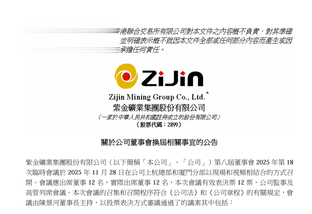 紫金矿业集团股份有限公司(以下简称"本公司"、"公司")第八届董事会2025年第18次临时会议于2025年11月28日在公司上杭总部和厦门分部以现场和视频相结合的方式召开。会议应出席董事12名,实际出席董事12名,本次会议有效表决票12票,公司监事及高管列席会议。本次会议的召集和召开程序符合《公司法》和《公司章程》的有关规定,会议由陈景河董事长主持,以投票表决方式审议通过了的议案其中包括: