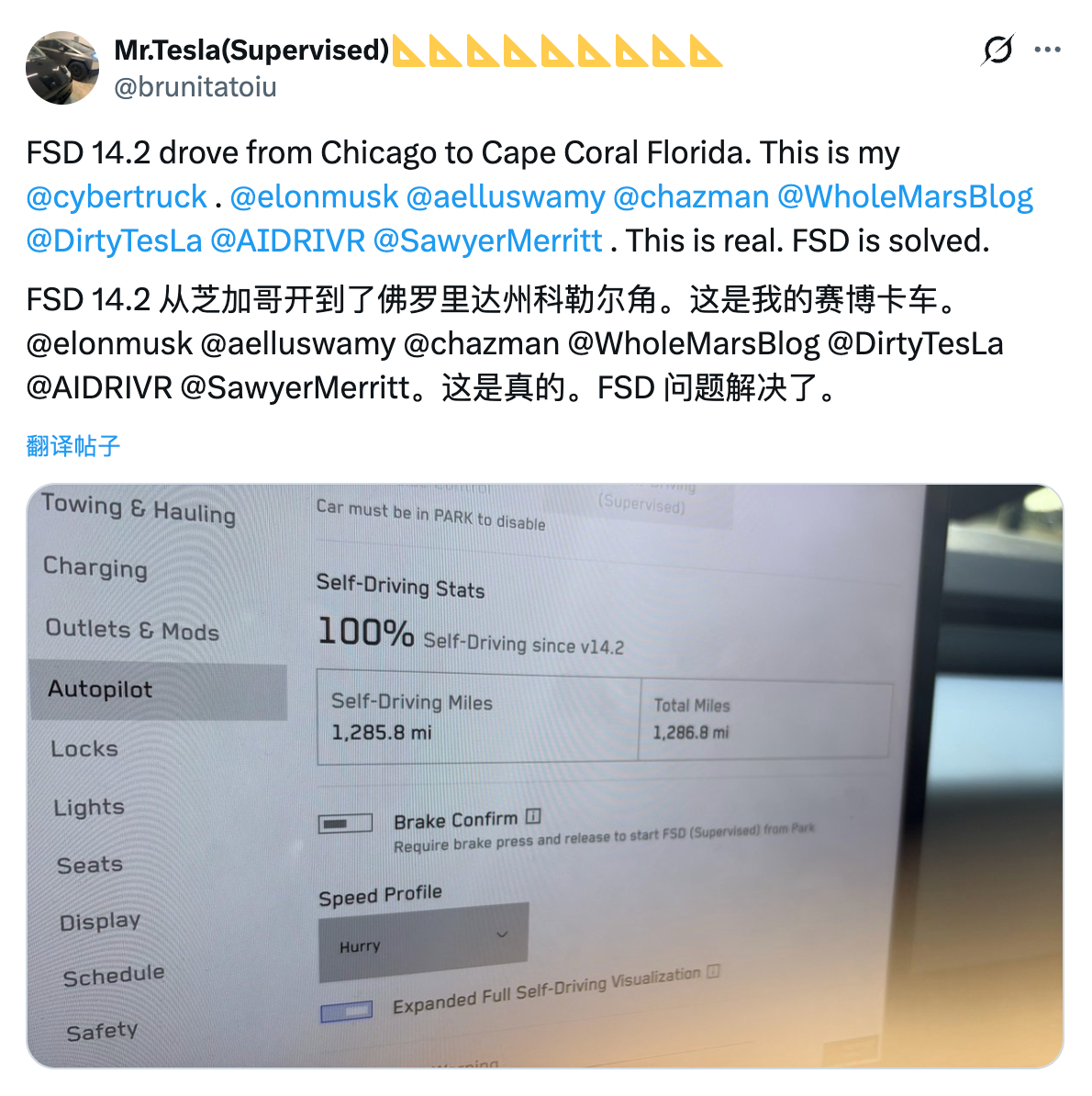一个网友用 FSD v14.2 从芝加哥开到了佛州,全程大概 1900 km,FSD 占比 100%。Elon Musk 吹这个牛是在 2016 年 10 月,说到 2017 年年底可以从 LA 一路自动驾驶到纽约。现在看基本实现了。时隔快十年,虽迟但到。