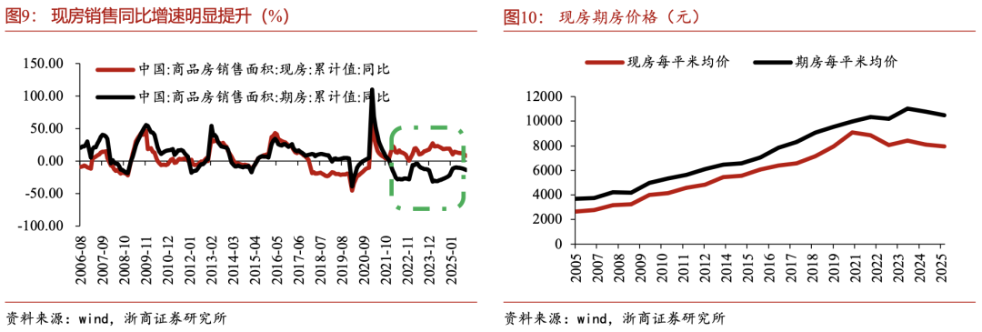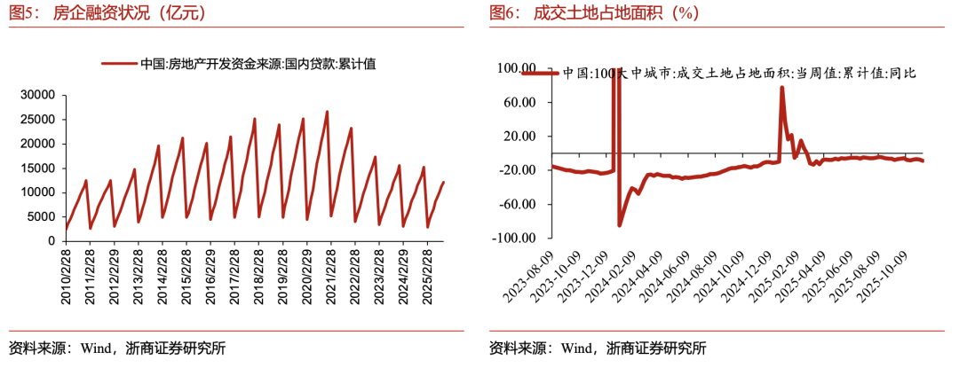 现房销售增速企稳是我们观测地产市场企稳的前瞻指标。当下整体地产销售压力较大,截至2025年10月商品房累计销售面积同比-6.8%,但现房销售维持正增,2025年8至10月累计增速分别为11.7%、9.9%、8.5%。意味着地产销售面积下行除本身有效需求不足外,也有“烂尾”担忧下居民主动转向现房购买的因素存在。当前现房供应比重仍有不足,抑制这部分购房需求,伴随未来现房供给在政策指导下进一步上升,现房销售增速可能先于期房企稳,是我们观测地产市场企稳的前瞻指标。