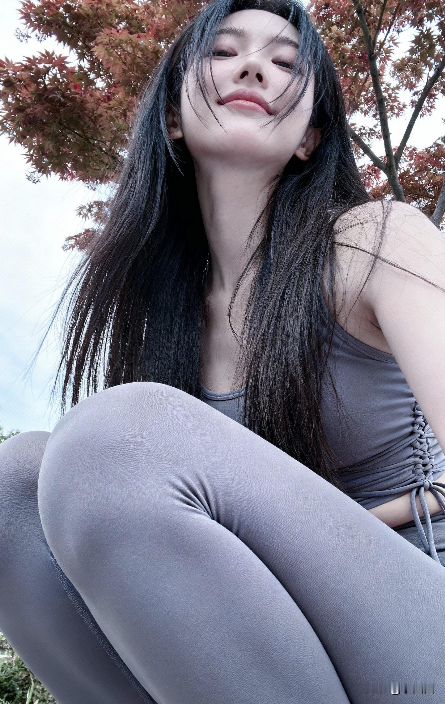 背后是红透的枫叶树🍁,暖调的秋景刚好中和了灰色的清冷感,连发丝被风掀起的弧度都透着松弛;没有刻意摆姿势,随意蜷腿的状态反而把“舒适自在”的气质拉满——这大概就是“穿搭衬人,人衬景”的绝佳范本吧✨