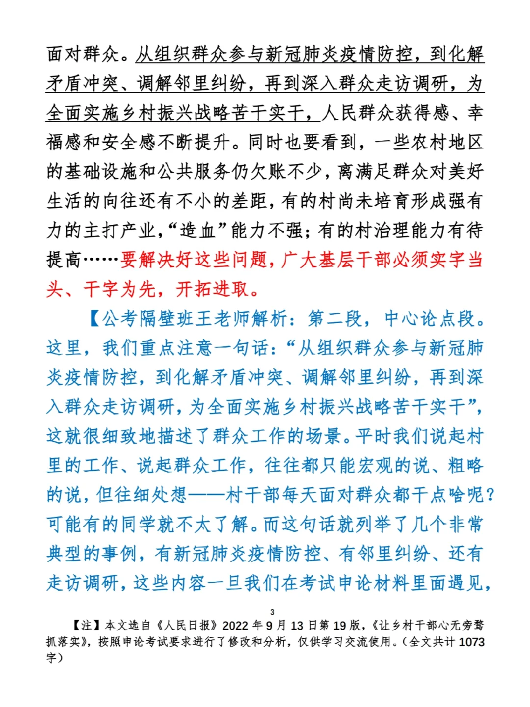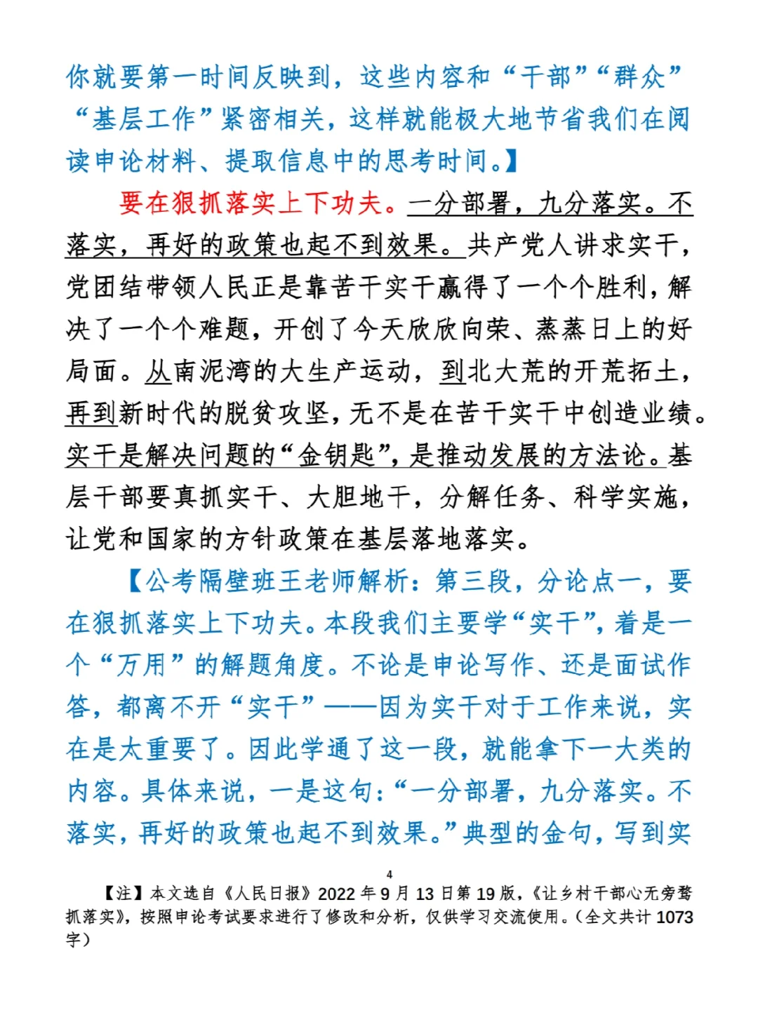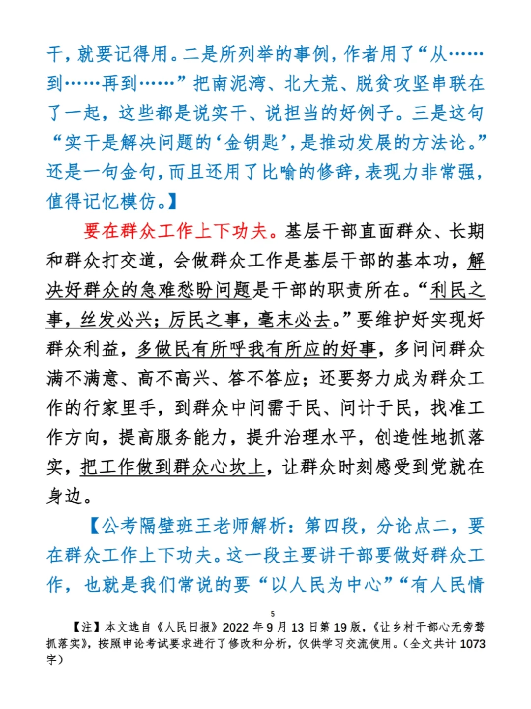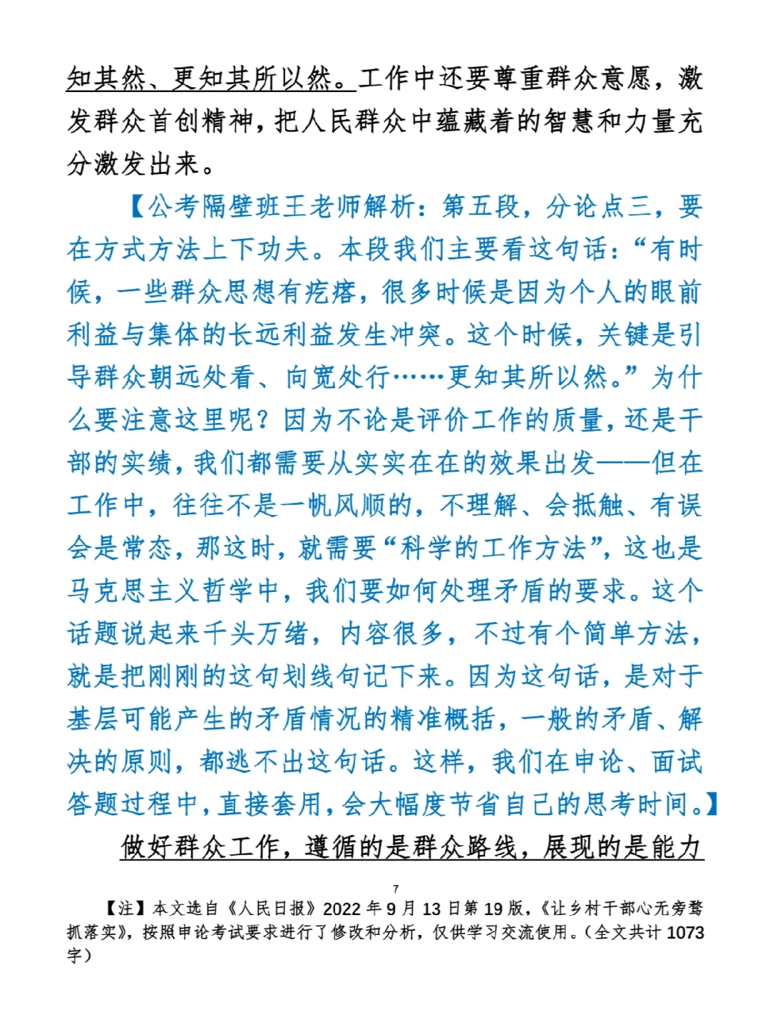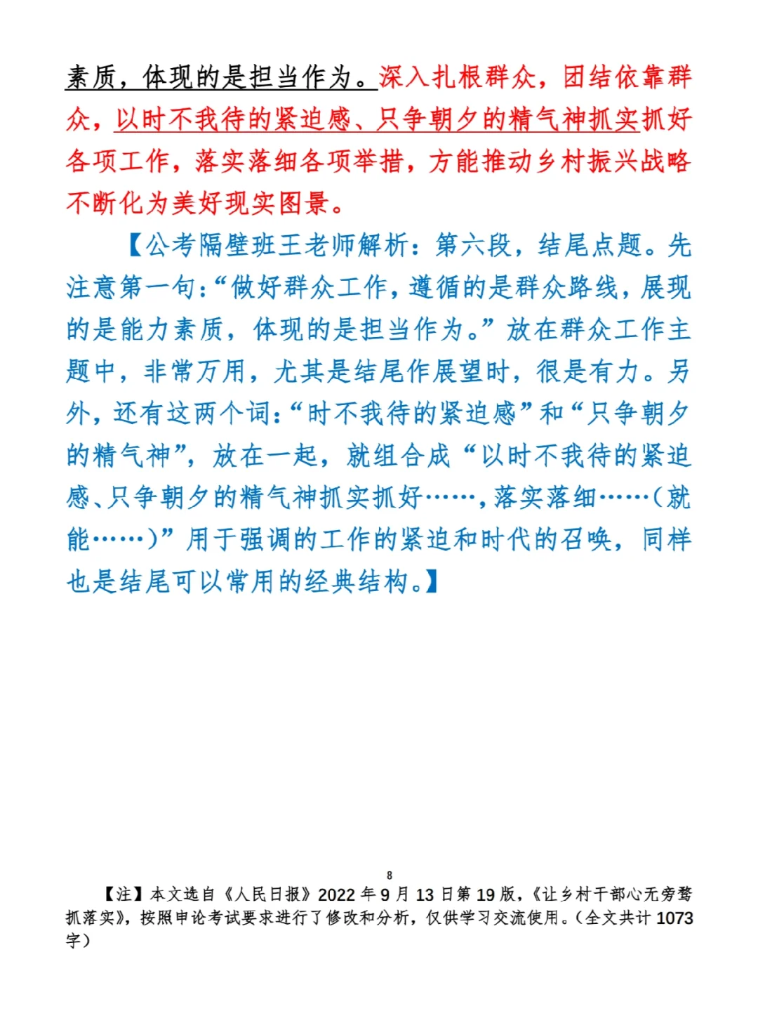 今日打卡作业: 1. 选一句你最喜欢的金句 2. 抄写全文红字+划线部分内容 3. 写完后在留言区打卡 ⭐️ ⭐️ ⭐️ ⭐️ ⭐️ ⭐️ 如何抄写:每天的抄写文章以图片形式发在“公考隔壁班王老师”账号,红色字是重点句和结构句,黑色字是正文,蓝色字是解析,大家抄写时不必抄蓝色字。建议先通读全文(包括蓝色解析部分),做到心中有数再开始抄写,效果会更好。 关于文章:抄写文章来源于人民日报,但每篇文章我都根据申论考试要求进行了修改,主要集中在四个方面:一是重写或修改开头、结尾;二是统一段首句句式结构;三是调整段落字数,使文章结构更均衡;四是简化复杂长难句,使之更具可模仿性。每篇文章修改幅度不同,无论修改多少,都是基于申论考试要求,毫无对人民日报文章品评之意。(此处致敬人民日报) 关于解析:我会在文章每段后面加一段蓝色字的解析,是我自己在抄写时的感悟,篇幅时间有限,不能面面俱到,但求重点突出。如果你有其他感悟,也希望能在评论里分享,我们相互学习、共同进步。 ⭐️ ⭐️ ⭐️ ⭐️ ⭐️ ⭐️ 这里是公考隔壁班王老师独创的“每天半小时・申论80分”抄写团,欢迎加入我们!