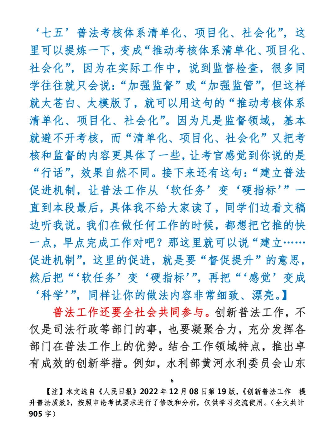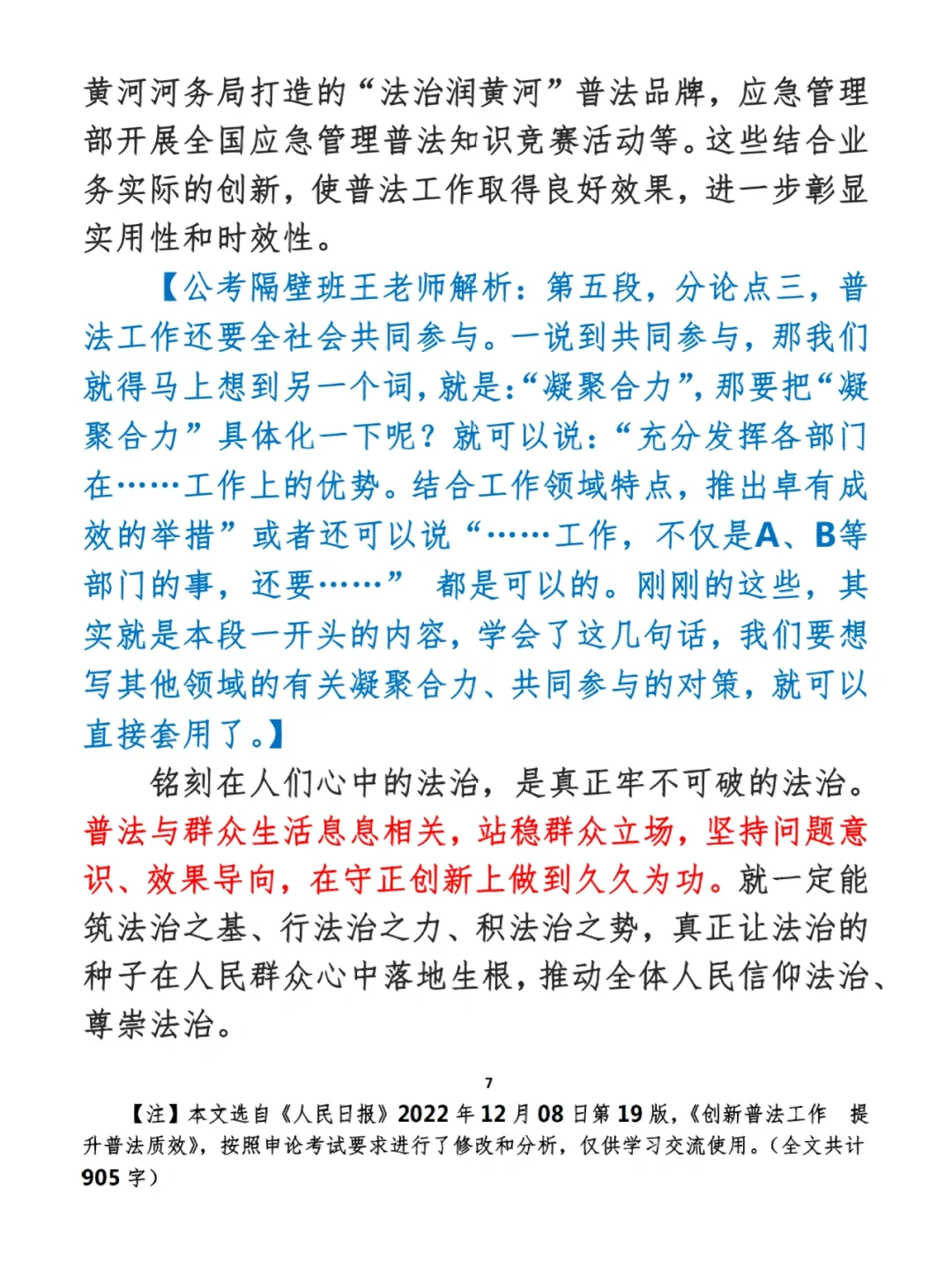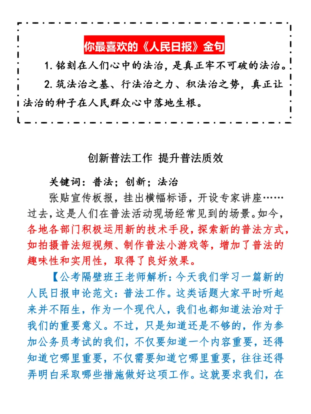 今日打卡作业: 1. 选一句你最喜欢的金句 2. 抄写全文红字+划线部分内容 3. 写完后在留言区打卡 ⭐️ ⭐️ ⭐️ ⭐️ ⭐️ ⭐️ 如何抄写:每天的抄写文章以图片形式发在“公考隔壁班王老师”账号,红色字是重点句和结构句,黑色字是正文,蓝色字是解析,大家抄写时不必抄蓝色字。建议先通读全文(包括蓝色解析部分),做到心中有数再开始抄写,效果会更好。 关于文章:抄写文章来源于人民日报,但每篇文章我都根据申论考试要求进行了修改,主要集中在四个方面:一是重写或修改开头、结尾;二是统一段首句句式结构;三是调整段落字数,使文章结构更均衡;四是简化复杂长难句,使之更具可模仿性。每篇文章修改幅度不同,无论修改多少,都是基于申论考试要求,毫无对人民日报文章品评之意。(此处致敬人民日报) 关于解析:我会在文章每段后面加一段蓝色字的解析,是我自己在抄写时的感悟,篇幅时间有限,不能面面俱到,但求重点突出。如果你有其他感悟,也希望能在评论里分享,我们相互学习、共同进步。 ⭐️ ⭐️ ⭐️ ⭐️ ⭐️ ⭐️ 这里是公考隔壁班王老师独创的“每天半小时・申论80分”抄写团,欢迎加入我们!
