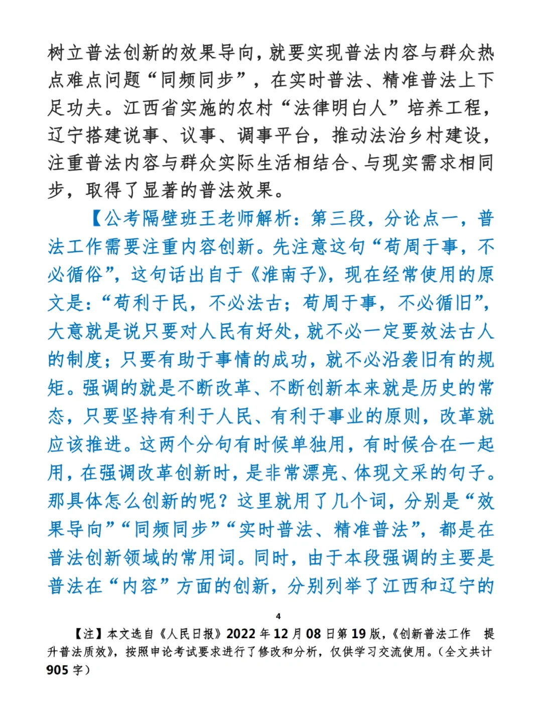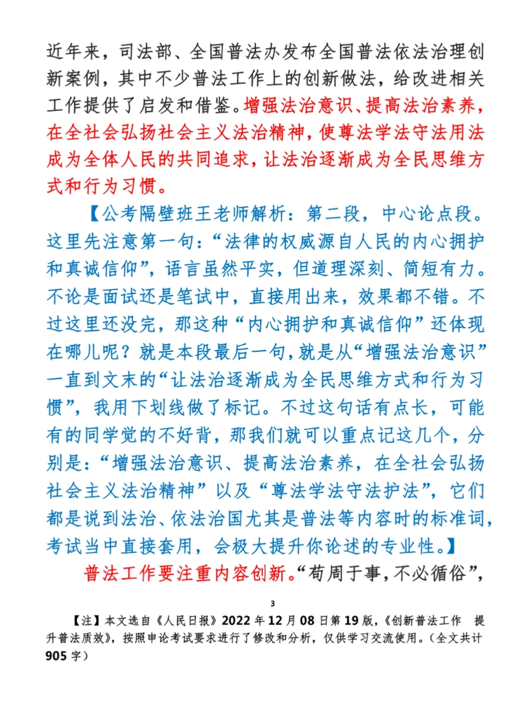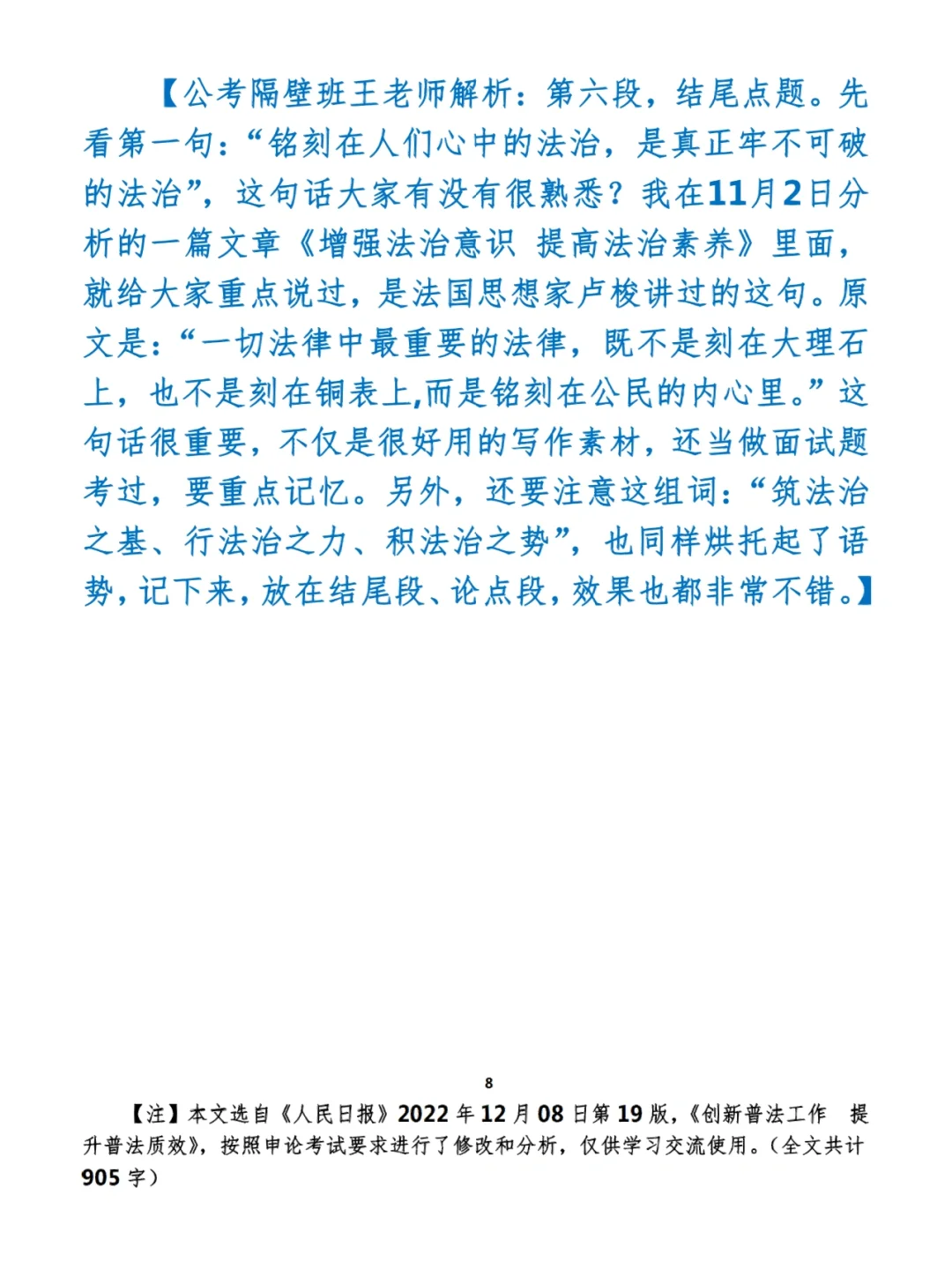 今日打卡作业: 1. 选一句你最喜欢的金句 2. 抄写全文红字+划线部分内容 3. 写完后在留言区打卡 ⭐️ ⭐️ ⭐️ ⭐️ ⭐️ ⭐️ 如何抄写:每天的抄写文章以图片形式发在“公考隔壁班王老师”账号,红色字是重点句和结构句,黑色字是正文,蓝色字是解析,大家抄写时不必抄蓝色字。建议先通读全文(包括蓝色解析部分),做到心中有数再开始抄写,效果会更好。 关于文章:抄写文章来源于人民日报,但每篇文章我都根据申论考试要求进行了修改,主要集中在四个方面:一是重写或修改开头、结尾;二是统一段首句句式结构;三是调整段落字数,使文章结构更均衡;四是简化复杂长难句,使之更具可模仿性。每篇文章修改幅度不同,无论修改多少,都是基于申论考试要求,毫无对人民日报文章品评之意。(此处致敬人民日报) 关于解析:我会在文章每段后面加一段蓝色字的解析,是我自己在抄写时的感悟,篇幅时间有限,不能面面俱到,但求重点突出。如果你有其他感悟,也希望能在评论里分享,我们相互学习、共同进步。 ⭐️ ⭐️ ⭐️ ⭐️ ⭐️ ⭐️ 这里是公考隔壁班王老师独创的“每天半小时・申论80分”抄写团,欢迎加入我们!