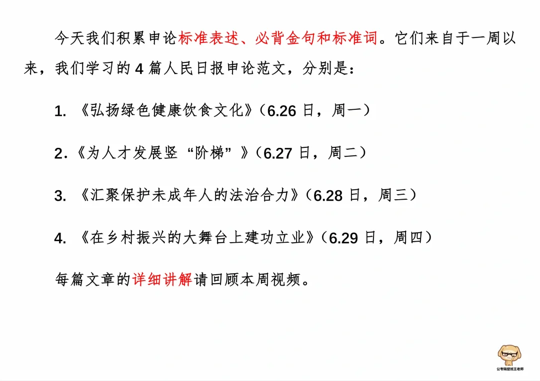 今天我们积累申论素材、必背金句和重点知识。它们来自于一周以来,我们学习的4篇人民日报申论范文,分别是: