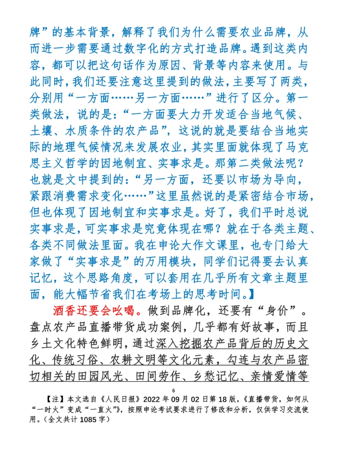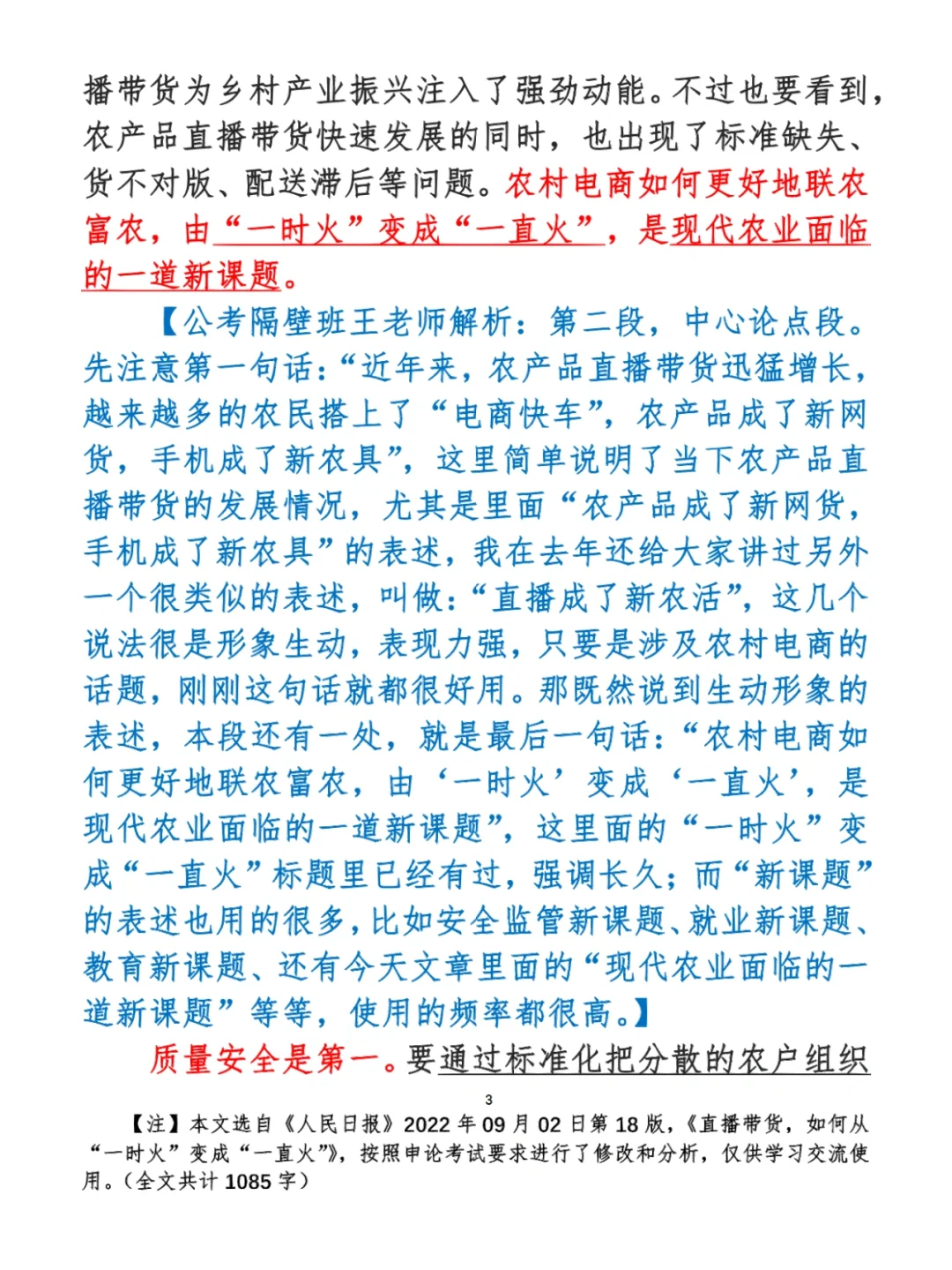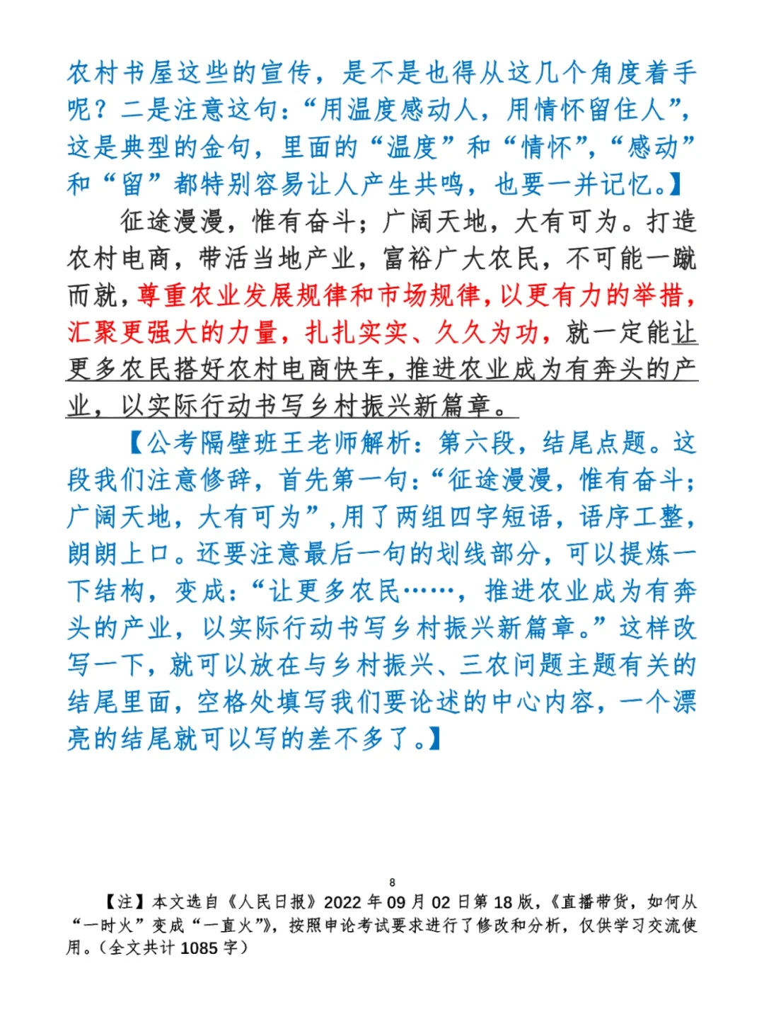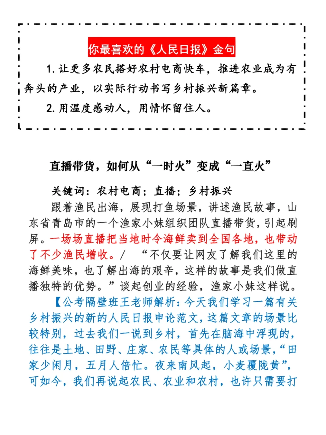 今日打卡作业: 1. 选一句你最喜欢的金句 2. 抄写全文红字+划线部分内容 3. 写完后在留言区打卡 ⭐️ ⭐️ ⭐️ ⭐️ ⭐️ ⭐️ 如何抄写:每天的抄写文章以图片形式发在“公考隔壁班王老师”账号,红色字是重点句和结构句,黑色字是正文,蓝色字是解析,大家抄写时不必抄蓝色字。建议先通读全文(包括蓝色解析部分),做到心中有数再开始抄写,效果会更好。 关于文章:抄写文章来源于人民日报,但每篇文章我都根据申论考试要求进行了修改,主要集中在四个方面:一是重写或修改开头、结尾;二是统一段首句句式结构;三是调整段落字数,使文章结构更均衡;四是简化复杂长难句,使之更具可模仿性。每篇文章修改幅度不同,无论修改多少,都是基于申论考试要求,毫无对人民日报文章品评之意。(此处致敬人民日报) 关于解析:我会在文章每段后面加一段蓝色字的解析,是我自己在抄写时的感悟,篇幅时间有限,不能面面俱到,但求重点突出。如果你有其他感悟,也希望能在评论里分享,我们相互学习、共同进步。 ⭐️ ⭐️ ⭐️ ⭐️ ⭐️ ⭐️ 这里是公考隔壁班王老师独创的“每天半小时・申论80分”抄写团,欢迎加入我们!